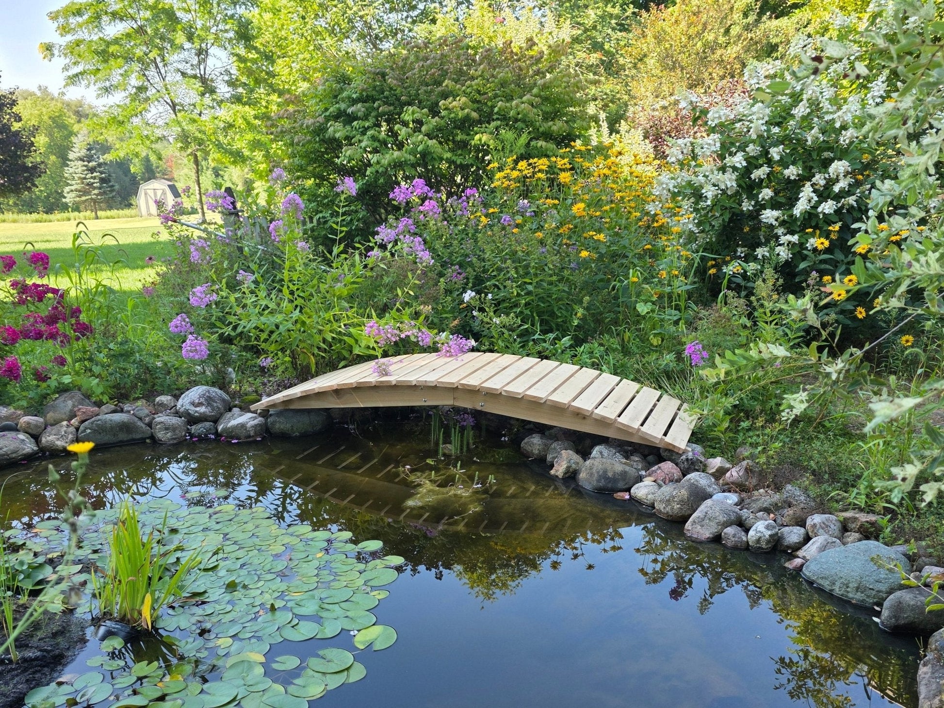 Our 8-foot rustic wooden garden bridge combines natural cedar craftsmanship with practical design, this handcrafted bridge creates an authentic focal point for gardens, water features, and landscaped paths.
