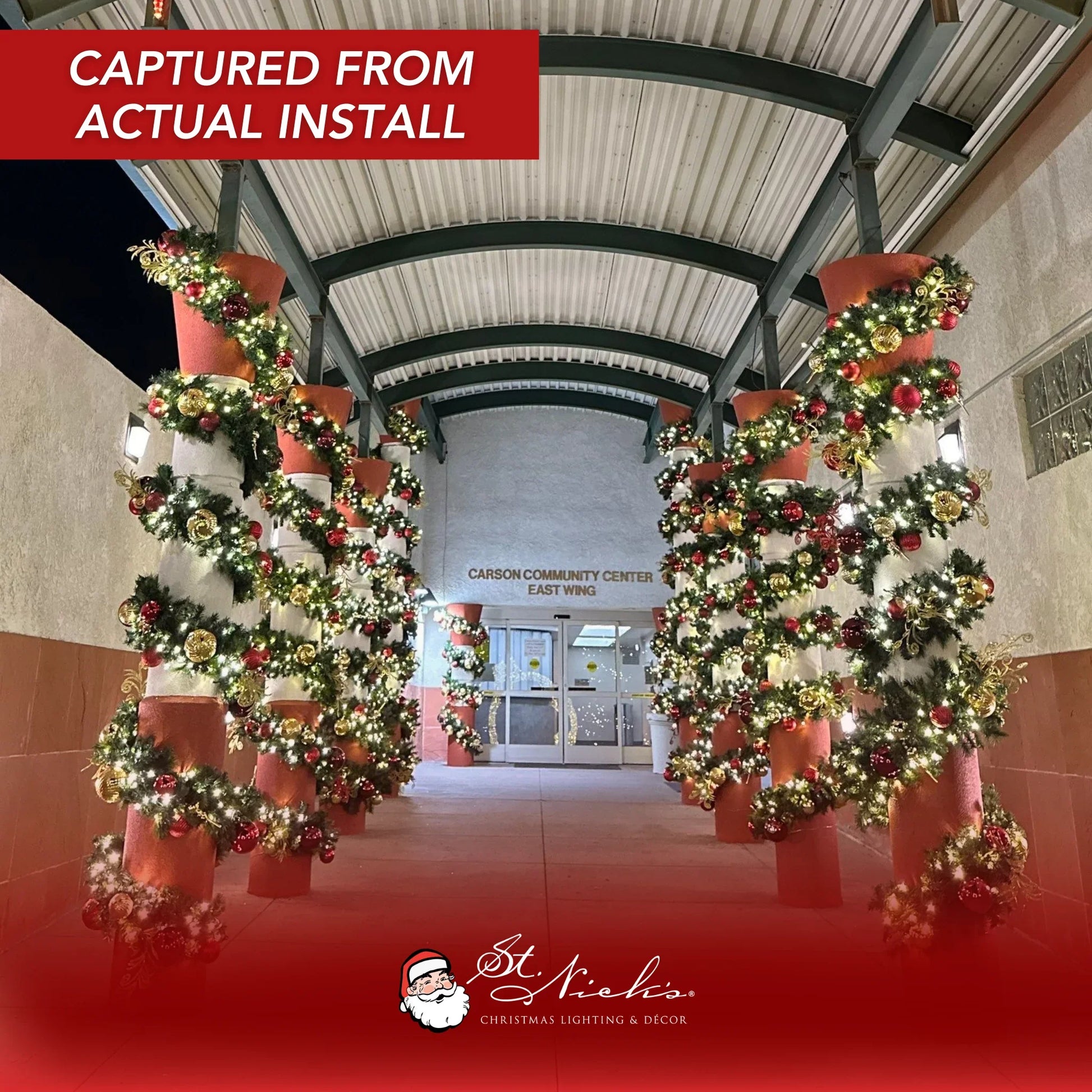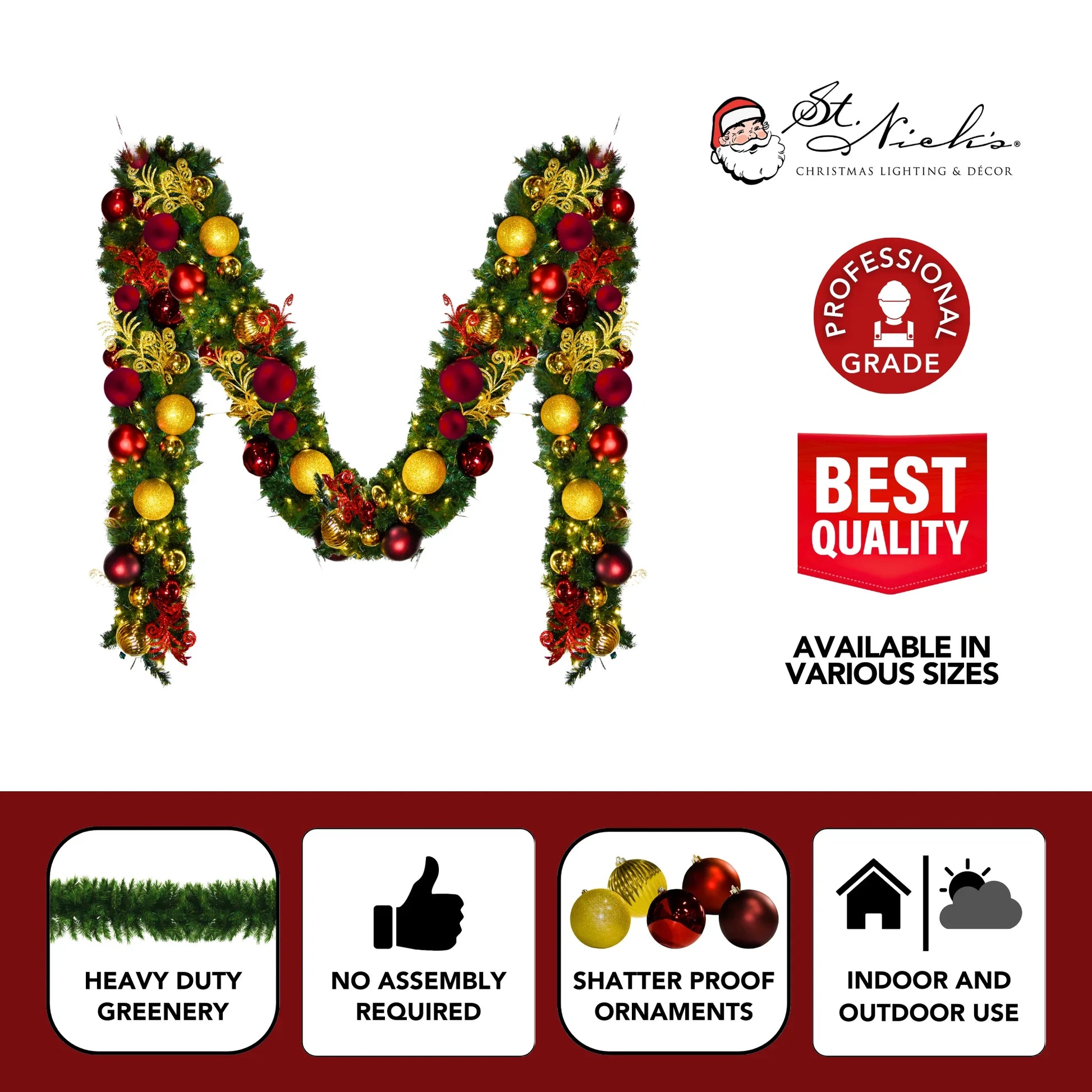 Create a warm and inviting atmosphere with our Predecorated Green Garland. Featuring a combination of red, gold, and burgundy ornaments, expertly arranged and illuminated by warm white lights, this garland brings a touch of elegance to your Christmas display. It's the perfect choice for decorating mantels, staircases, or entryways.