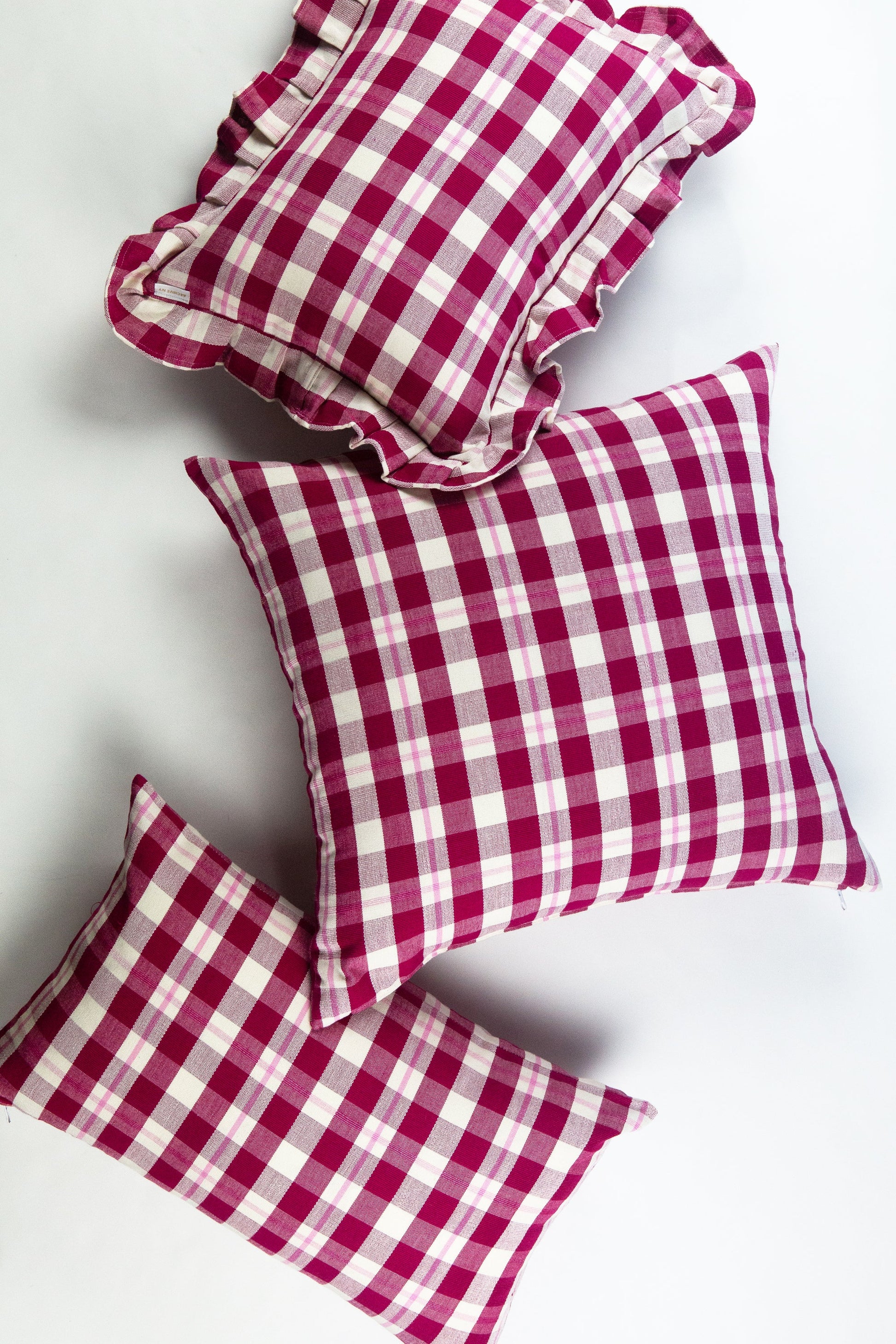 The Abigail plaid pillow is the perfect accent to add vibrant color and texture to any sofa, bedroom or accent chair. Stripes of raspberry and a hint of light pink are woven together to create this seasonal and timeless piece. Ethically handwoven by artisans in Xela, Guatemala.