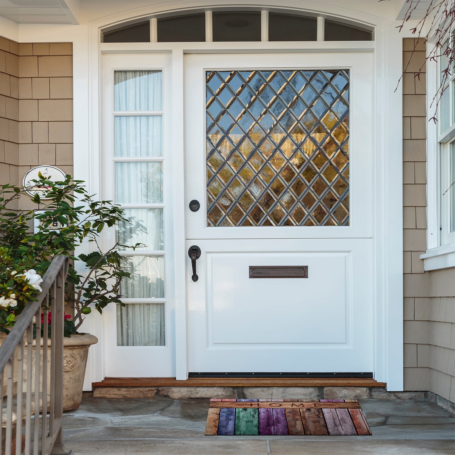 Achim’s Family of Home Furnishings Heavy Duty Outdoor Rubber Mat will add a warm welcome to your home. The rich hues and regal design, make this outdoor welcome mat beautiful and anything but average! It features a Colorful Plank Designed. Sure to make your new mat standout! Made from 100% recycled rubber, these outdoor mats are stylish, eco-friendly and ULTRA durable! The soft polyester fiber surface offers both function and fashion as it keeps the dirt outside while brightening up any entryway. The mats are very easy to clean too! Just shake, sweep or wash with a garden hose and leave to air dry. Bring the beauty of your home to your door and let your guests feel welcome before they step inside! DIMENSIONS: 18x30 Inches. The surface of the mat is made of polyester fiber, while the backing is made of recycled rubber. This mat will keep the dirt outside. To clean just shake, sweep, or hose-off. SIZE: 18x30 Inches