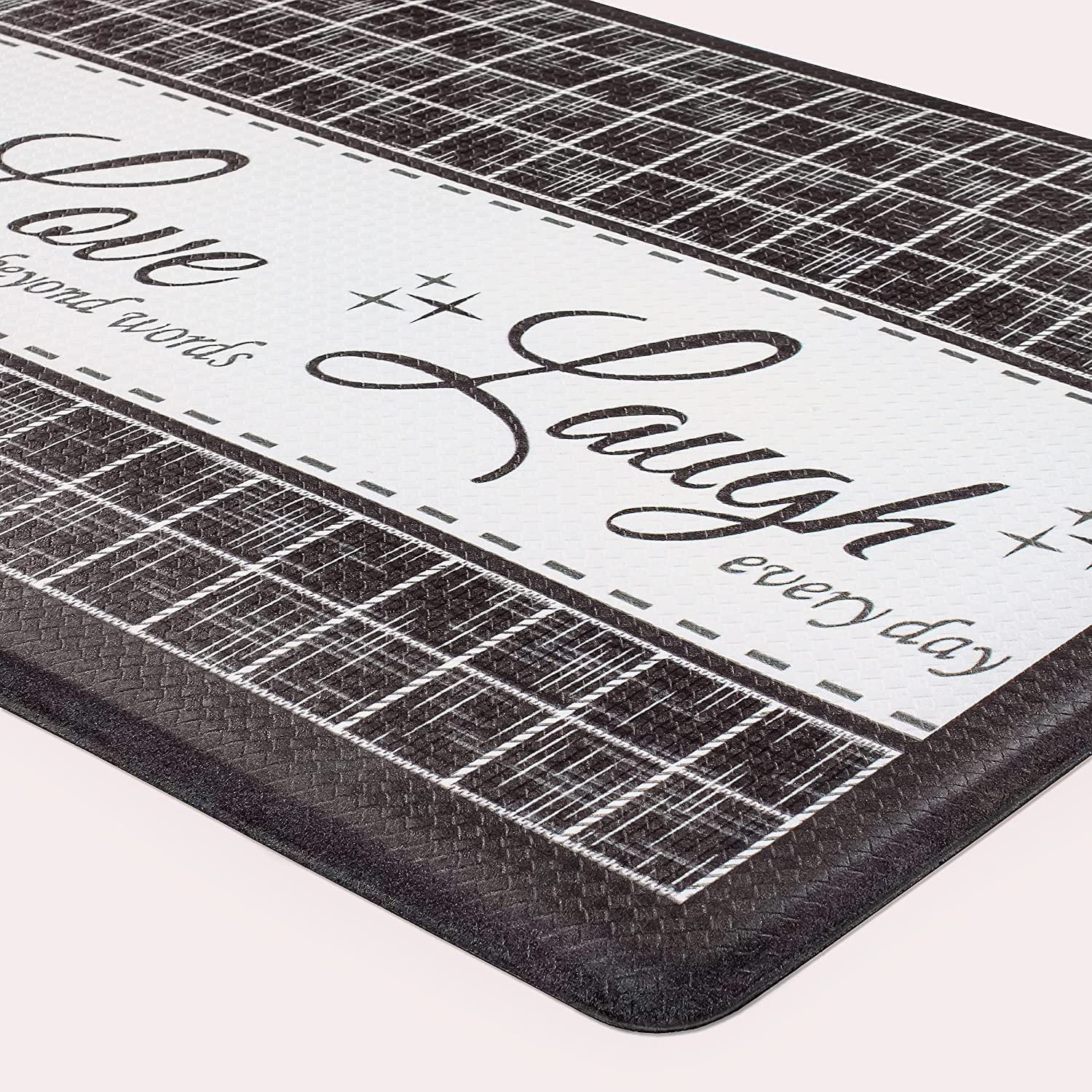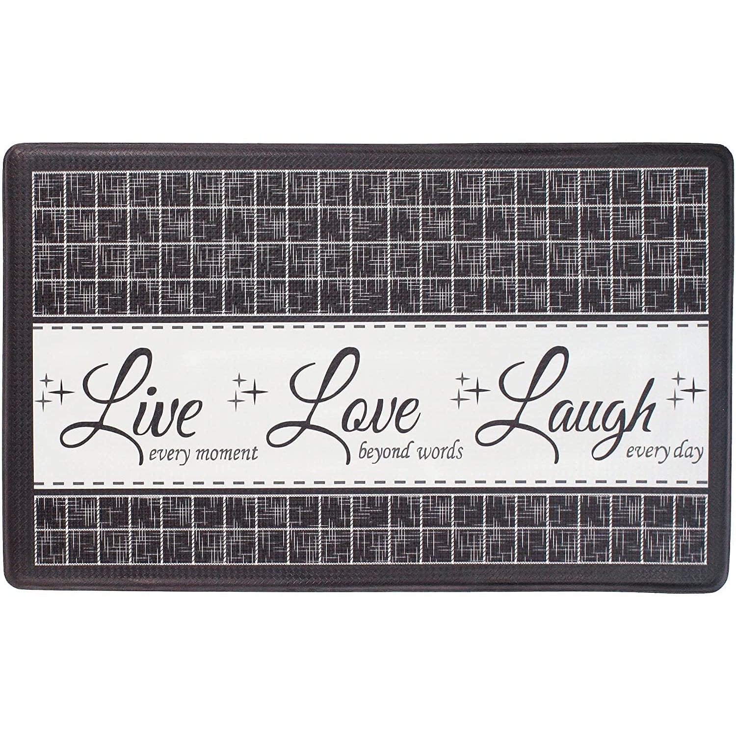Standing for long periods of time can take a toll on your muscles and joints. This Achim Decorative Anti-Fatigue Mat is the best comfort mat you will ever own. Featuring a charming “Live Love Laugh” design, this anti fatigue mat is sure to add a nice touch and a country farmhouse feel to any space. Place this mat where you stand most and it will reduce and relieve the pressure on your knees, feet and joints. The cushiony foam will conform to the contours of your feet and reduce fatigue while you stand. Standing while you work has never been easier! The poly vinyl chloride (PVC) foam construction of this Anti Fatigue Mat makes it very strong and durable. Poly Vinyl Chloride is used mostly in building materials because of its resilience. Puncture, tear, mildew, and stain resistant, this anti fatigue mat will provide you with superior comfort and last a very long time! This anti-fatigue mat not only looks good, but it is super easy to clean too! Just wipe down with a moist washcloth and mild detergent. The non-slip base of this mat will prevent falling. Increase productivity and decrease injury with these mats. Perfect for bedrooms, kitchens, laundry rooms, garages or even exercise rooms. COLOR: Charcoal-White. DIMENSIONS: 18x30 Inches.
