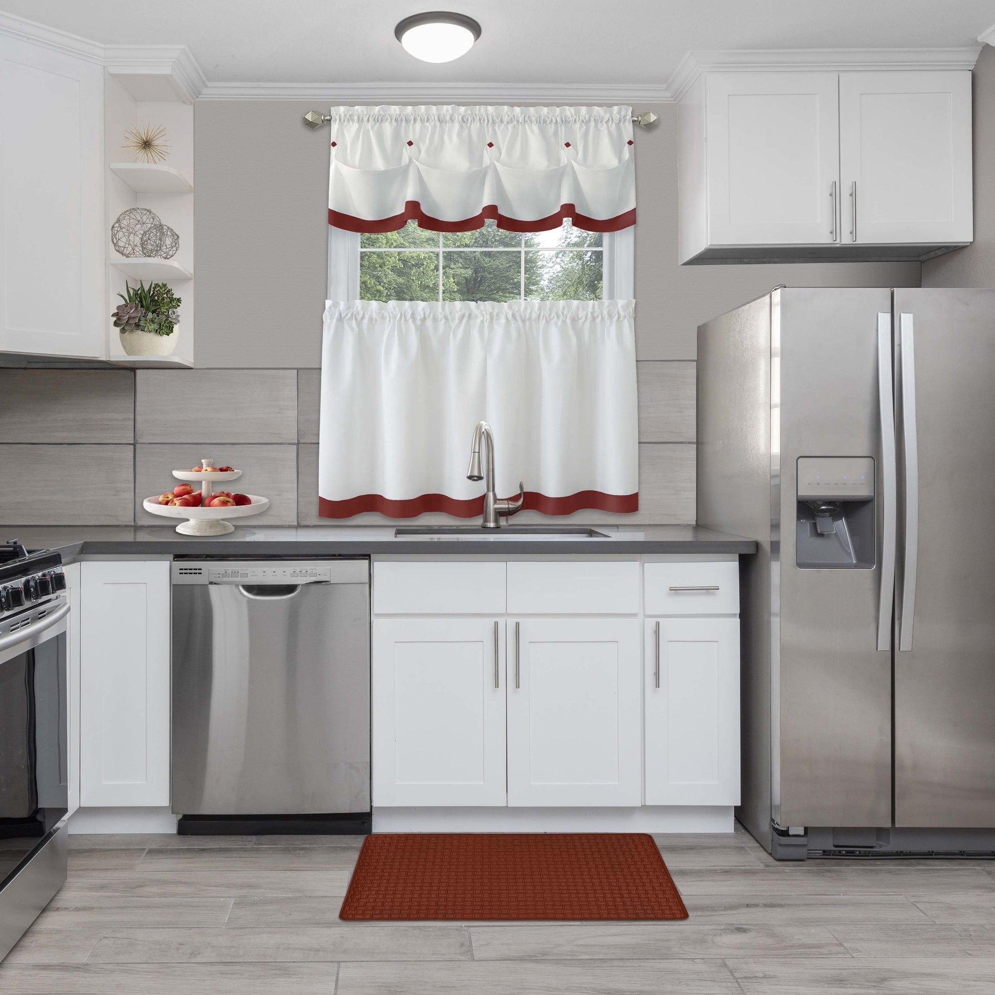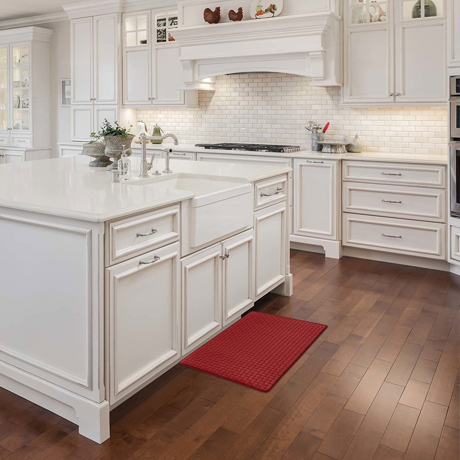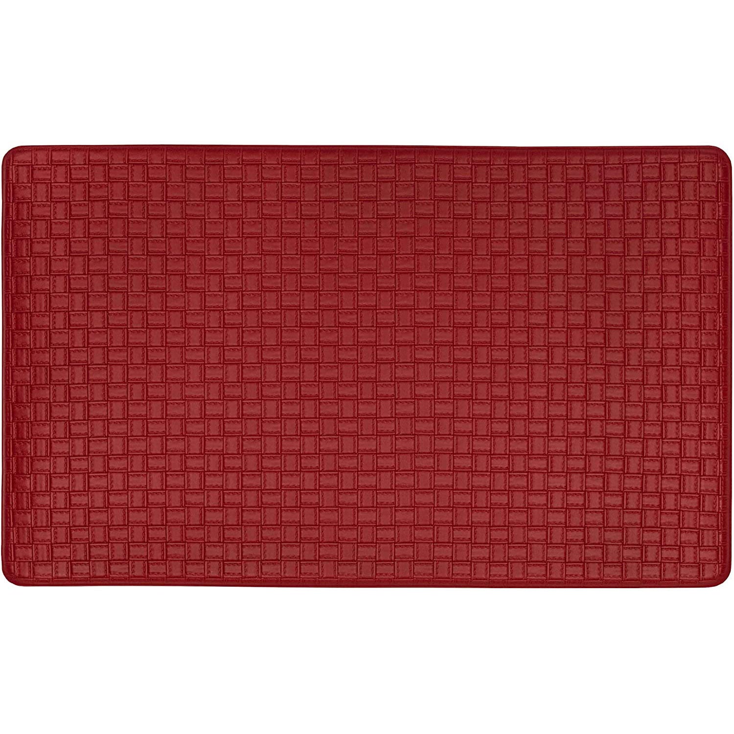 Ease your back and leg pain with this Achim Woven-Embossed Faux-Leather Anti-Fatigue Mat. This anti-fatigue mat provides support to help reduce fatigue when standing, while adding a decorative touch to your kitchen or bathroom. Features solid colored and embossed to resemble woven leather strips with baseball stitching. Made of durable and supportive Eco PVC foam. It gives support to your knees, ankles and back. Anti-fatigue mats are the perfect choice for any space. Perfect kitchen mat, provides relief for those standing for long amounts of time without compromising beauty in your home space. The mat is designed with a beveled edge and non-slip backing, helpful to protect you from slipping and tripping. Easy to clean and this mat can be utilized for a wide variety of uses. CARE: Clean with brush, broom, vacuum or shake briskly. MATERIAL: Eco PVC Foam. SIZE: 18x30 Inches. COLOR: Lava