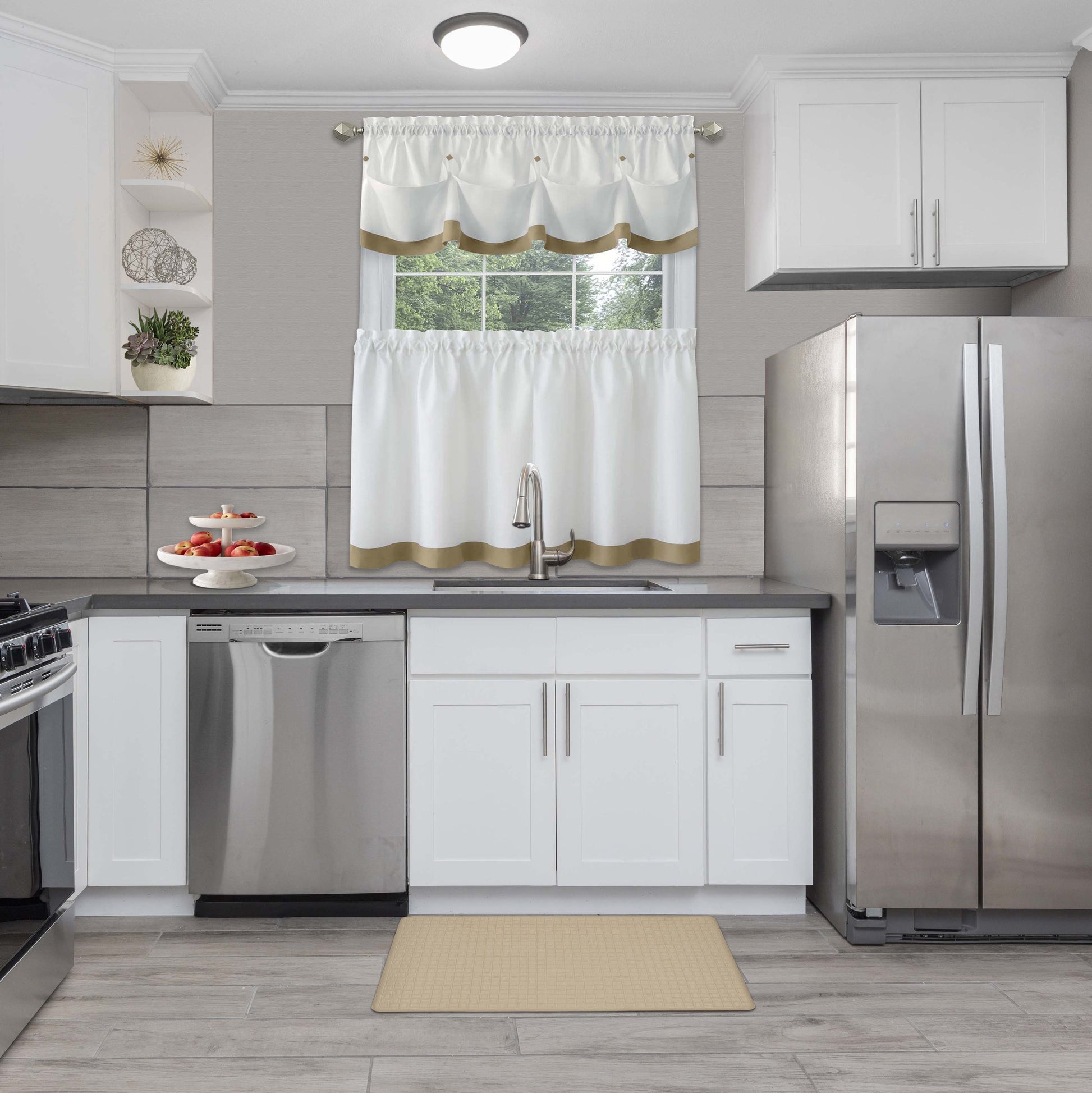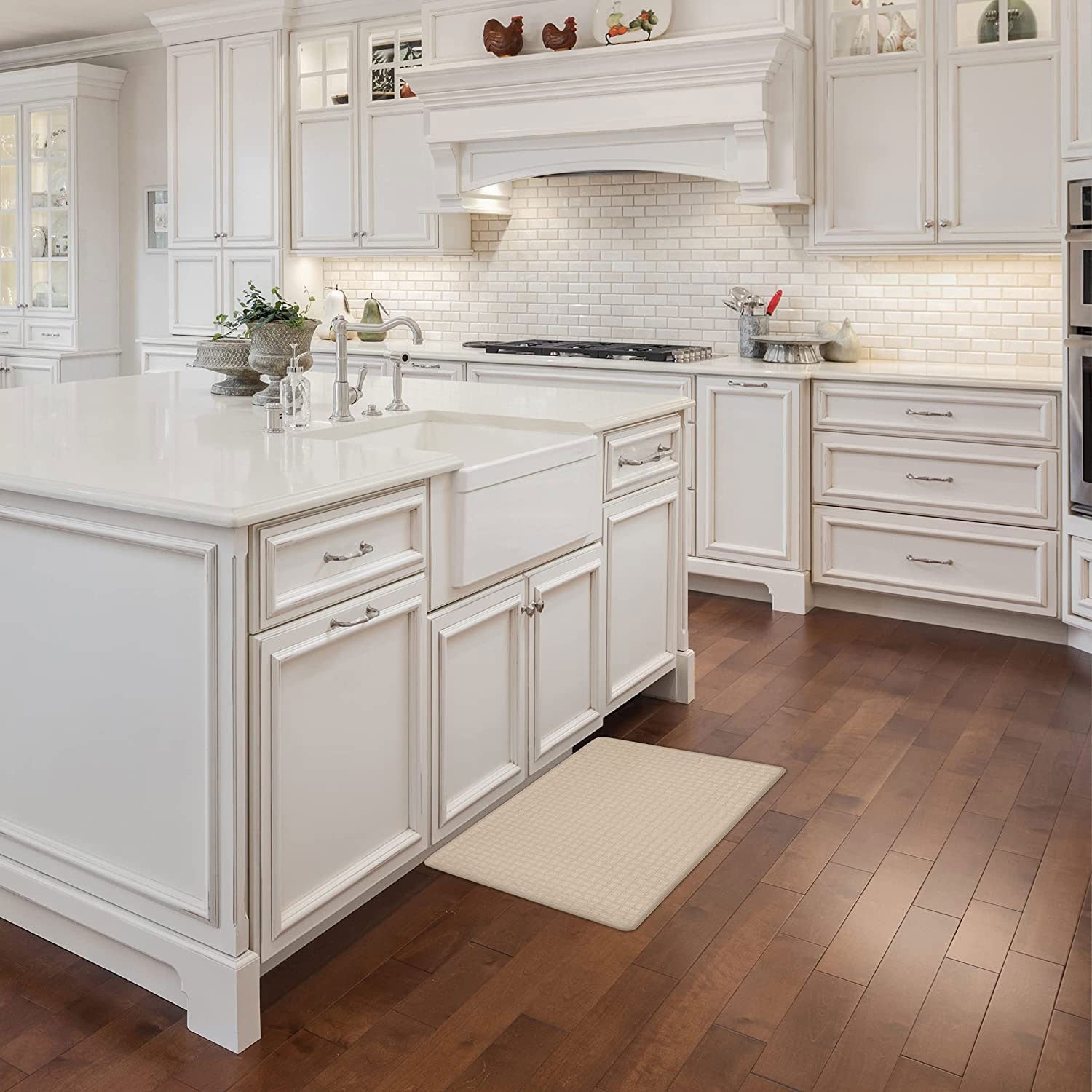 Ease your back and leg pain with this Achim Woven-Embossed Faux-Leather Anti-Fatigue Mat. This anti-fatigue mat provides support to help reduce fatigue when standing, while adding a decorative touch to your kitchen or bathroom. Features solid colored and embossed to resemble woven leather strips with baseball stitching. Made of durable and supportive Eco PVC foam. It gives support to your knees, ankles and back. Anti-fatigue mats are the perfect choice for any space. Perfect kitchen mat, provides relief for those standing for long amounts of time without compromising beauty in your home space. The mat is designed with a beveled edge and non-slip backing, helpful to protect you from slipping and tripping. Easy to clean and this mat can be utilized for a wide variety of uses. CARE: Clean with brush, broom, vacuum or shake briskly. MATERIAL: Eco PVC Foam. SIZE: 18x30 Inches. COLOR: Tan