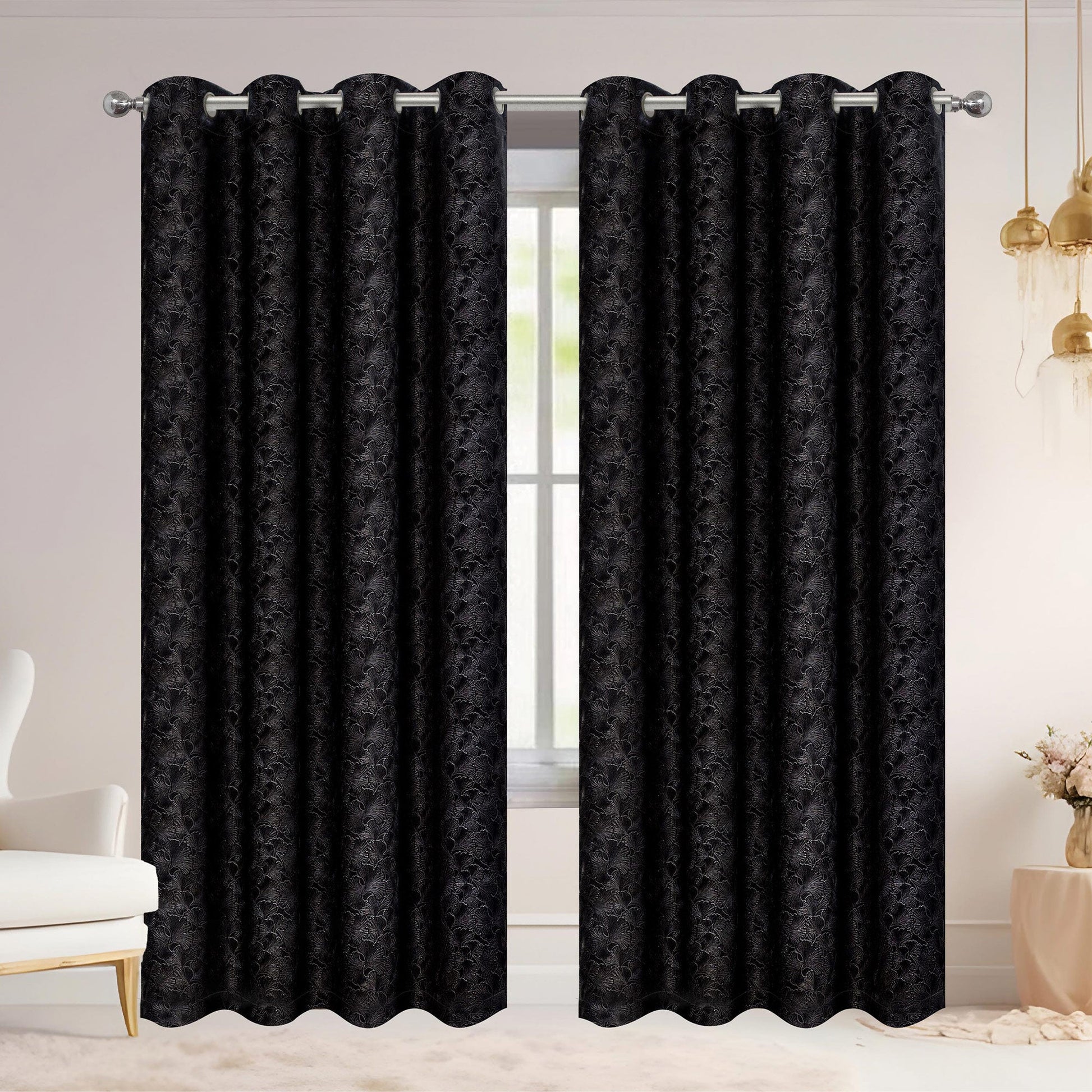 Picture your windows draped in the Adelia Ginkgo Biloba Leaf Lace Room Darkening Grommet Window Curtain Panel, infusing your space with romantic charm and sophisticated elegance. These 54x84 Inches panels, crafted from soft yet durable polyester, are designed to transform your windows into a captivating design feature. The delicate Ginkgo Biloba Leaf lace pattern, intricately woven throughout the fabric, introduces a classic touch, casting a warm and inviting glow as light filters through. Available in a curated palette of rich and beautiful colors—silver, white, navy blue, burgundy, blush, and black—these curtains offer versatility, allowing you to seamlessly integrate them with your existing décor. The polished metal grommet top ensures effortless installation, creating graceful, flowing folds that enhance the room's ambiance. Beyond their aesthetic appeal, these panels provide effective room darkening capabilities, minimizing external light intrusion and creating a tranquil, private atmosphere. Experience the perfect blend of romantic design and practical function, as these curtains elevate your home with their timeless beauty.