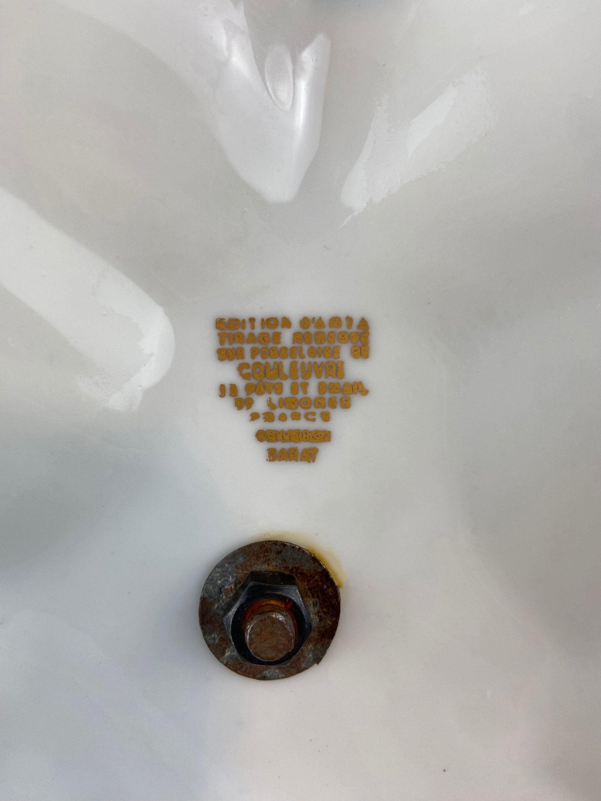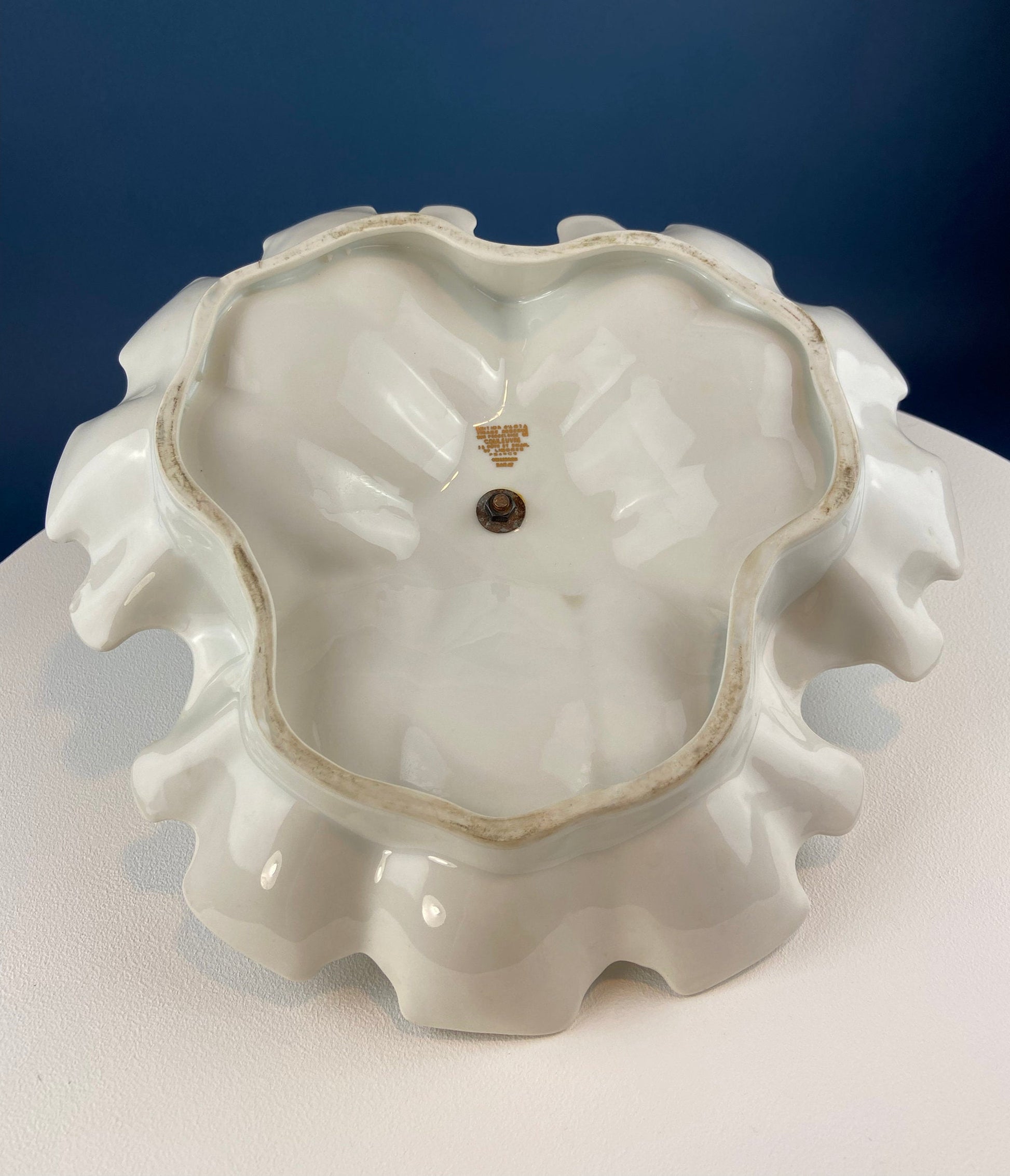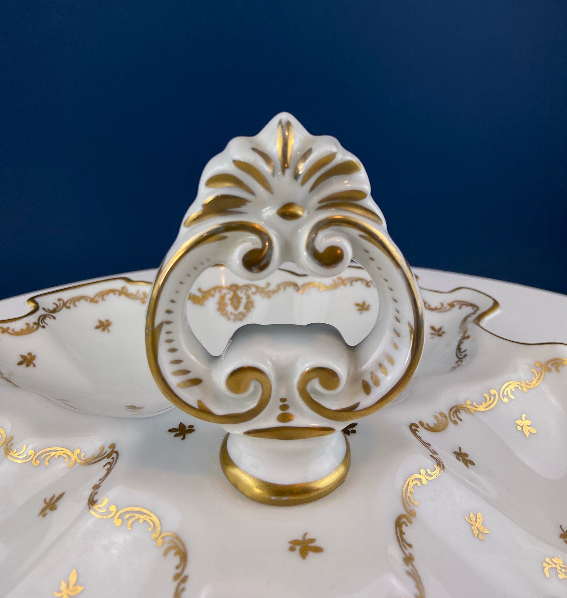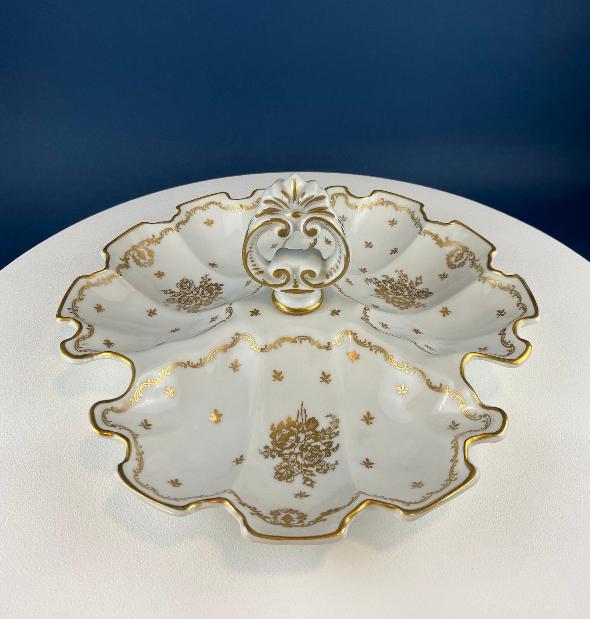 Three Section Divided Porcelain Bowl with Handle in Center. Antique Limoges Divided Dish with Scalloped Rim. Stunning Gold Floral Motif. Very Fine Porcelain Made in France. Wedding Gift. Cottagecore Living. Table Centerpiece. Marked by Manufacturer. Very Rare Finding. Excellent Condition.