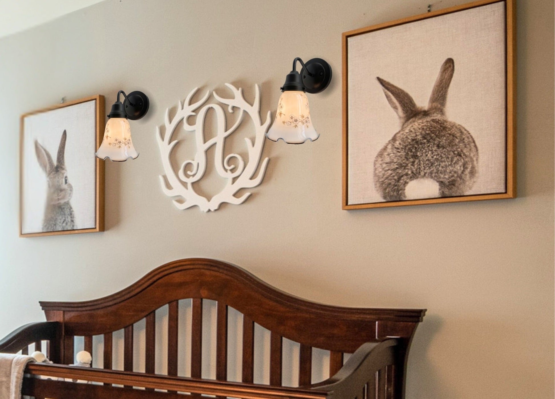 - 10" overall height, projects 8.5" from wall and is 6" wide Authentic Antique Milk Glass shade with printed floral design and ruffled edge
