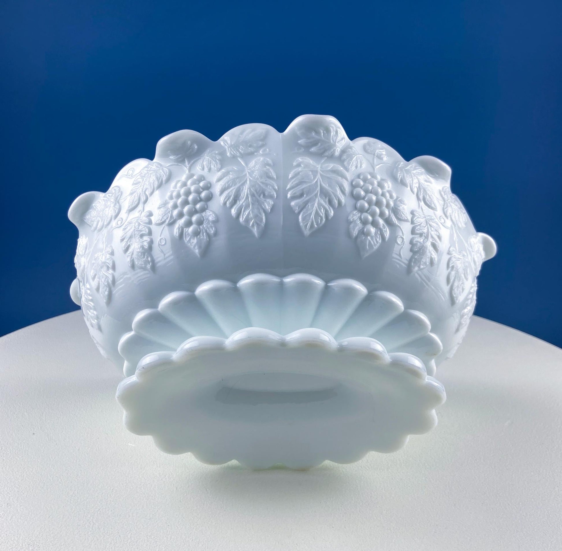 Antique Westmoreland Milk Glass Bowl with Embossed Grapes and Vines Motif and Scalloped Edge. White Oval Serving Dish. Table Kitchen Decor. Modern Farmhouse. French Country. Excellent Condition.