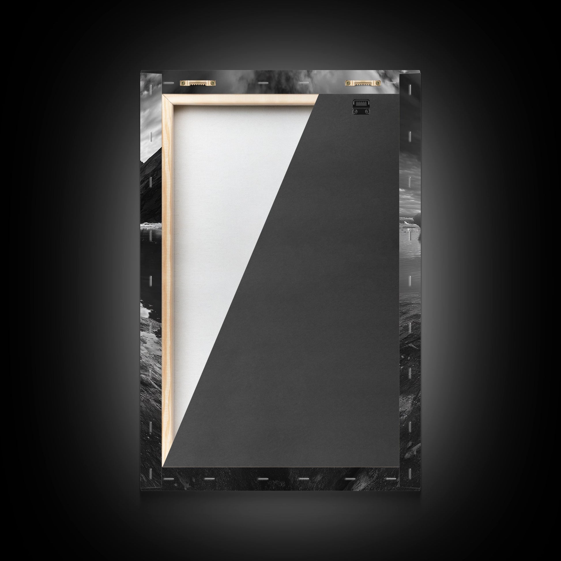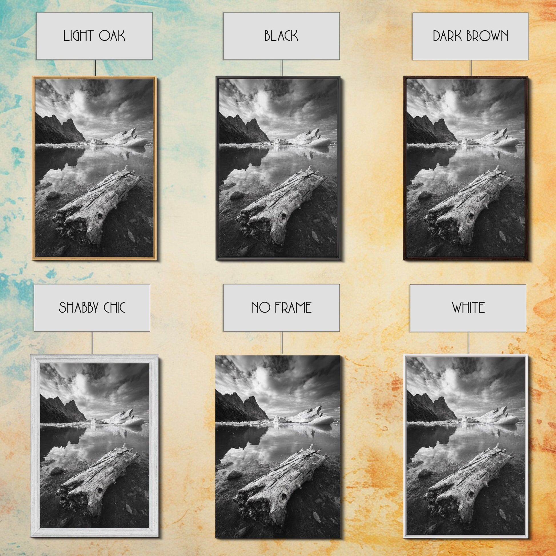 Arctic Driftwood View, Iceberg Horizon, Moody Mountains, Framed Canvas Print, Office Wall Art, Monochrome Nature, Nordic Aesthetic