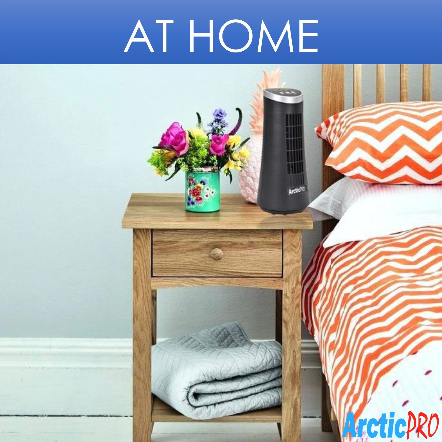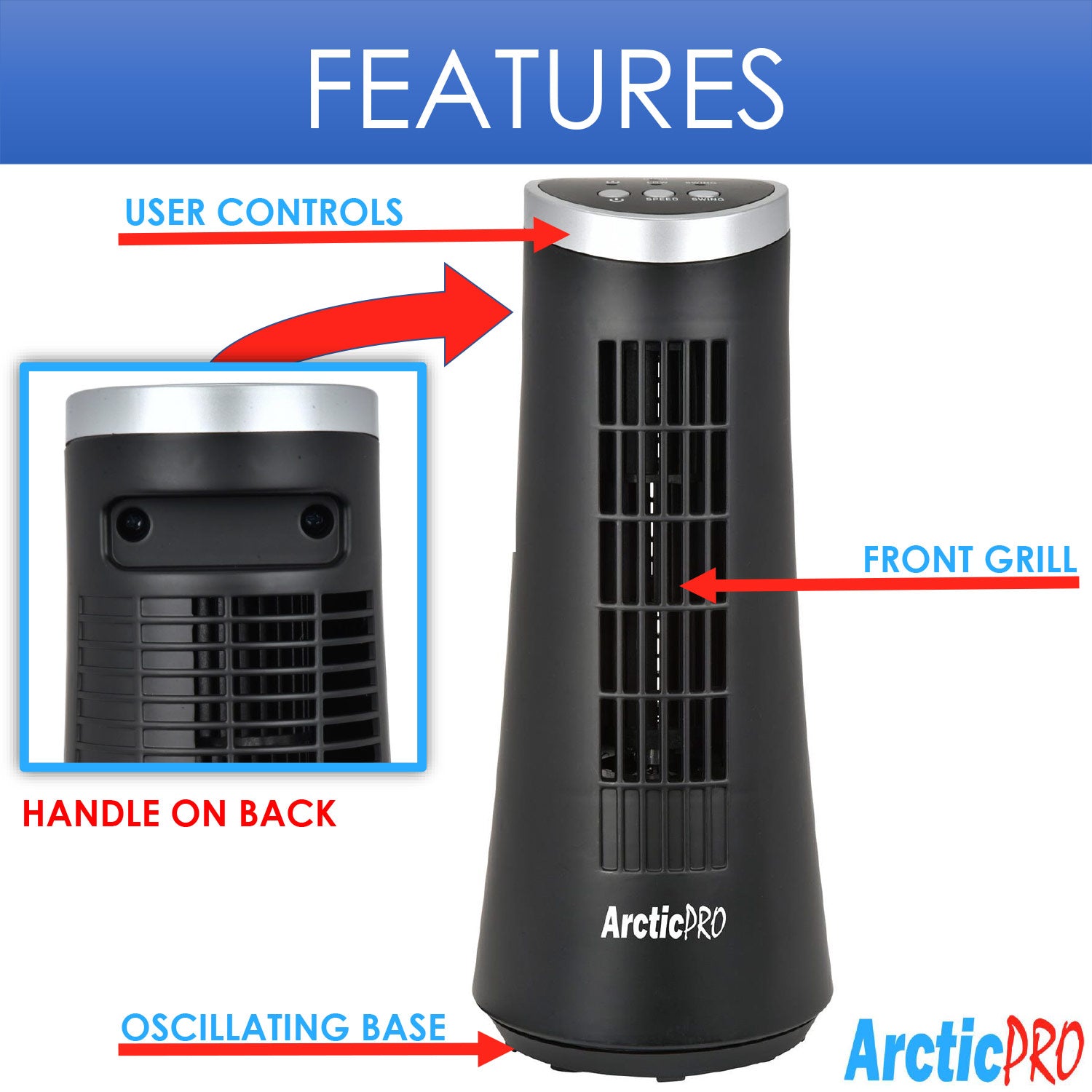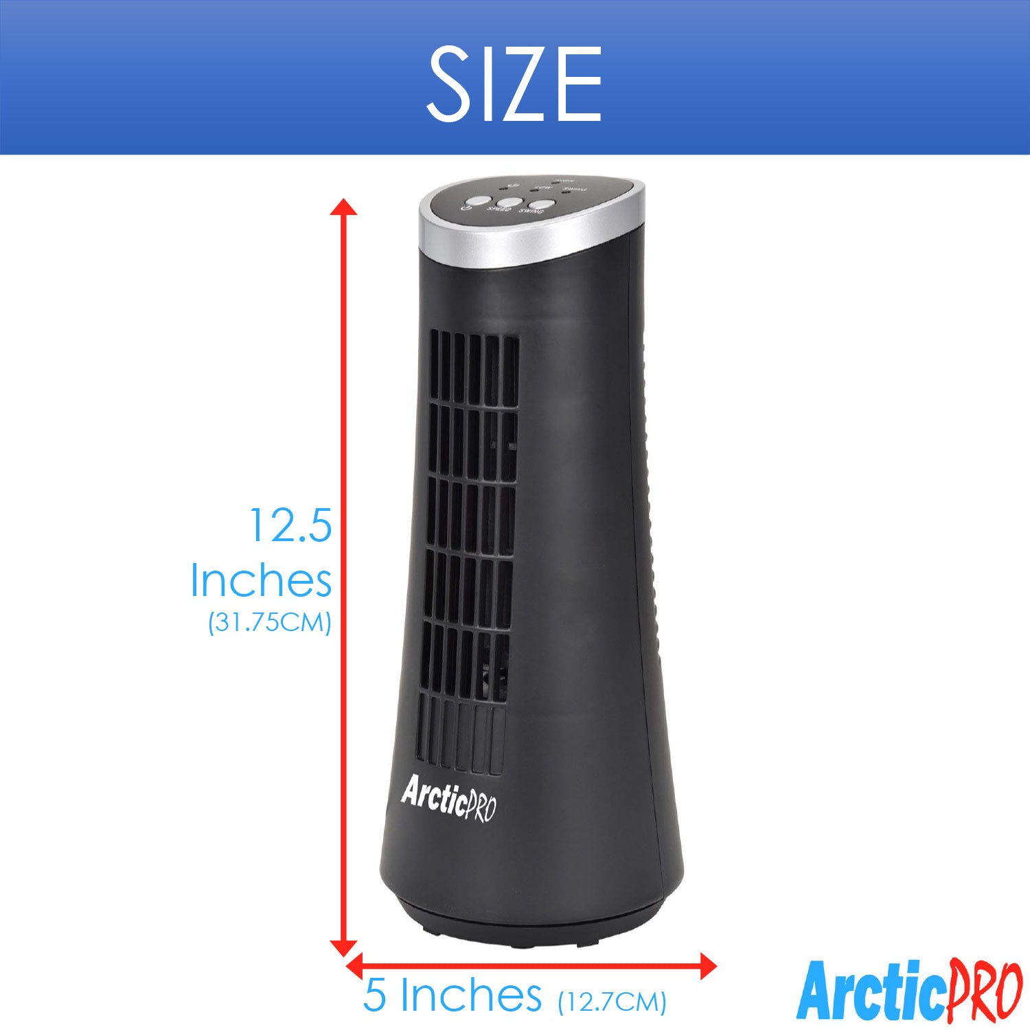 Cool down your office, bedroom or any room that needs a cool and quiet breeze with the Mini Desktop Oscillating Tower Fan By Arctic-Pro. It’s small and compact design is great for your desk space or by your bedside night table. Featuring a whisper quiet operation motor, you are able to complete your daily task without any distractions. This powerful oscillating fan provides versatile air circulation for personal comfort. Use the electric touch controls to adjust the speed and oscillation control. Set the fan from low to High or keep the fan stationary or oscillate, it's up to you. Turn the desktop fan on and choose your setting! It’s 75 degree wide oscillation will cool down and provide you with even air distribution. It is ideal for offices, classrooms, and bedrooms, kitchens, desks, kids’ rooms, cubicles, use this slim desktop tower fan anywhere. Featuring a convenient carrying handle this mini tower fan is perfect for traveling and transporting from one room to another. It’s unique look and amazing performance will keep you cool. DIMENSIONS: 5x12 Inches. COLOR: Black.