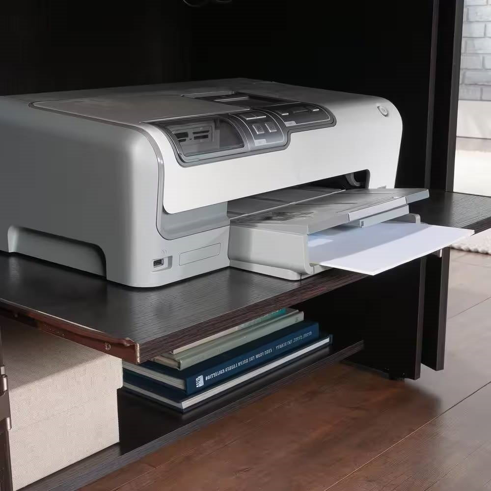 If collecting craft supplies has become as much of a hobby as crafting itself, this Armoire with Drop Leaf Computer Desk Craft Table in Dark Brown Wood Finish should be your next investment. This computer armoire easily conceals an extra workspace until you’re ready, with a drop leaf work table that fully extends, revealing an entire work surface. It’s the perfect spot for drawing, painting, working from a laptop, or placing a sewing machine. The center shelf of this armoire with fold-out desk also features a power strip with six outlets for convenient electrical access without the chaos of cord clutter. Six adjustable shelves provide convenient and flexible space for storage of files, folders, stencils or reams of paper. The lower slide-out shelf of this craft armoire offers retractable storage space for a printer or a cricut machine, providing easy access or a hiding space. Finished in dark, elegant Dakota Oak, with Soft White accents, this space-saving cabinet can function as a craft or sewing armoire, an office armoire, or all three!