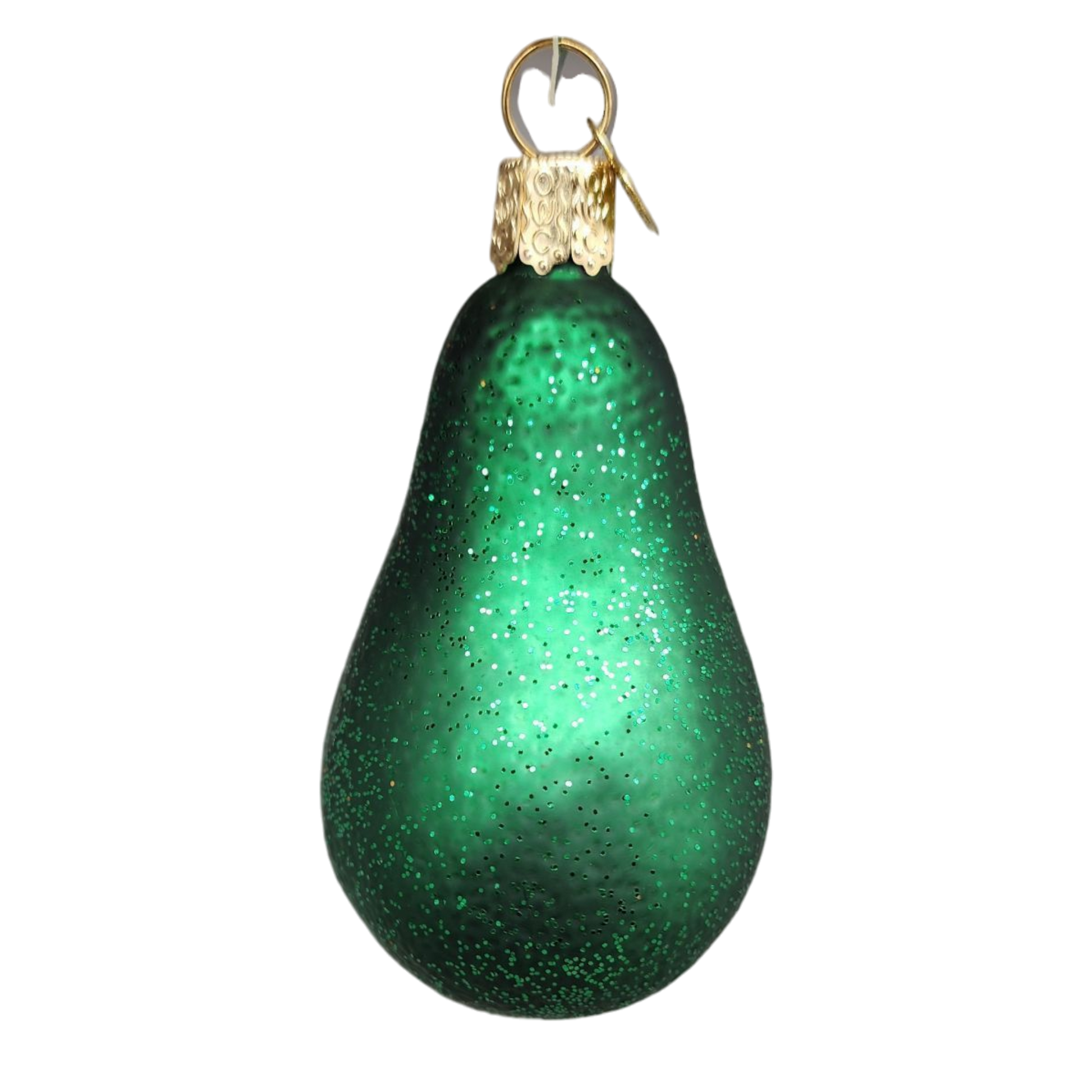 Legend has it that the first avocado was eaten by a Mayan Princess in Mexico around 300 B.C. It is also known as the alligator pear which describes the fruit's texture and pear shape. This beautiful glass ornament was carefully crafted for you to enjoy as a holiday decoration.