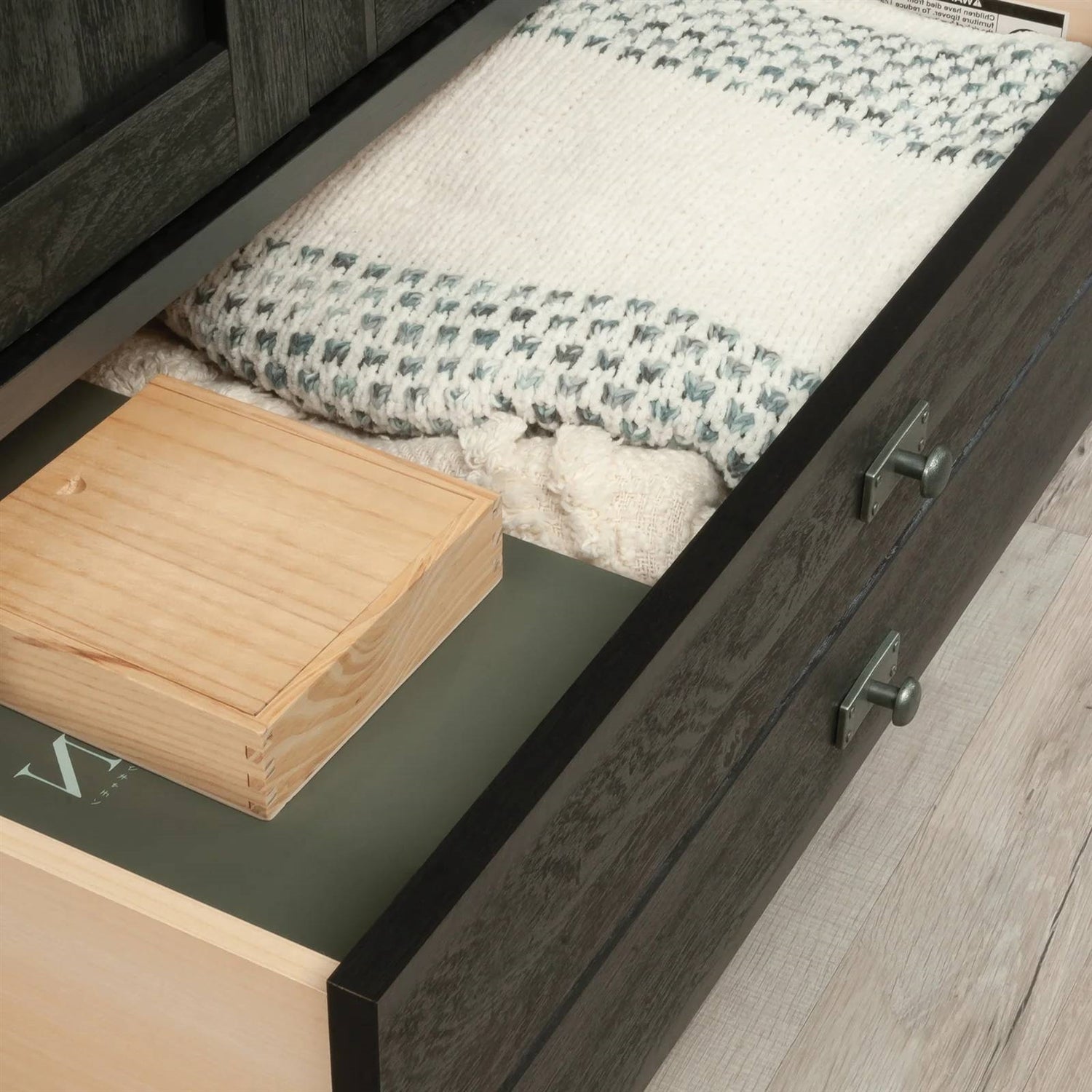 - Finished in soft white, mystic oak, or Raven Oak finish with Lintel Oak accent