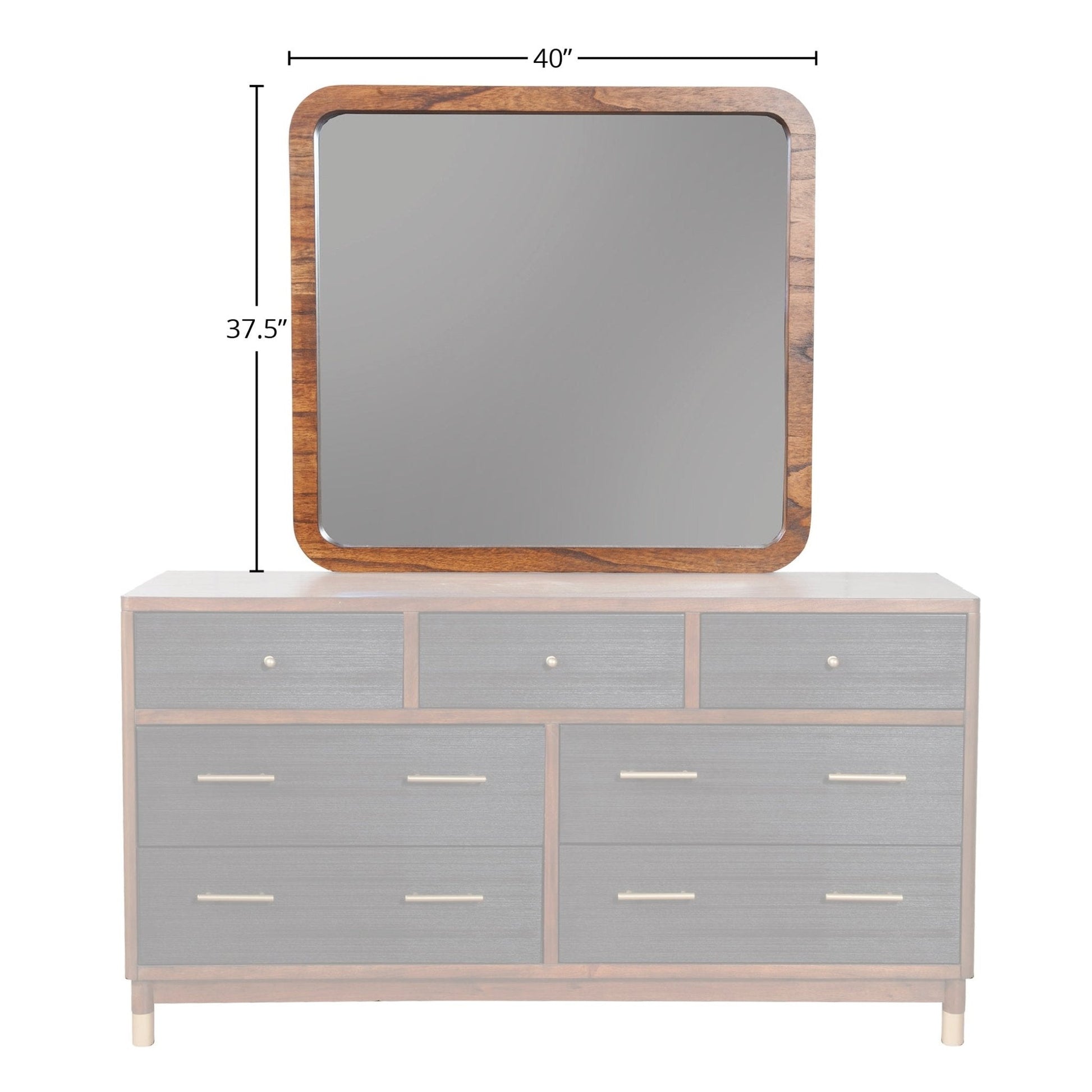 Transitional styling, the Belham Bedroom collection combines multiple materials including Mahogany solids for a sophisticated look. The bedroom mirror is finished in a dark walnut (brown) finish. Attaches to coordinating dresser sold separately. Coordinates with other pieces from the Alpine Furniture Belham bedroom collection also sold separately.