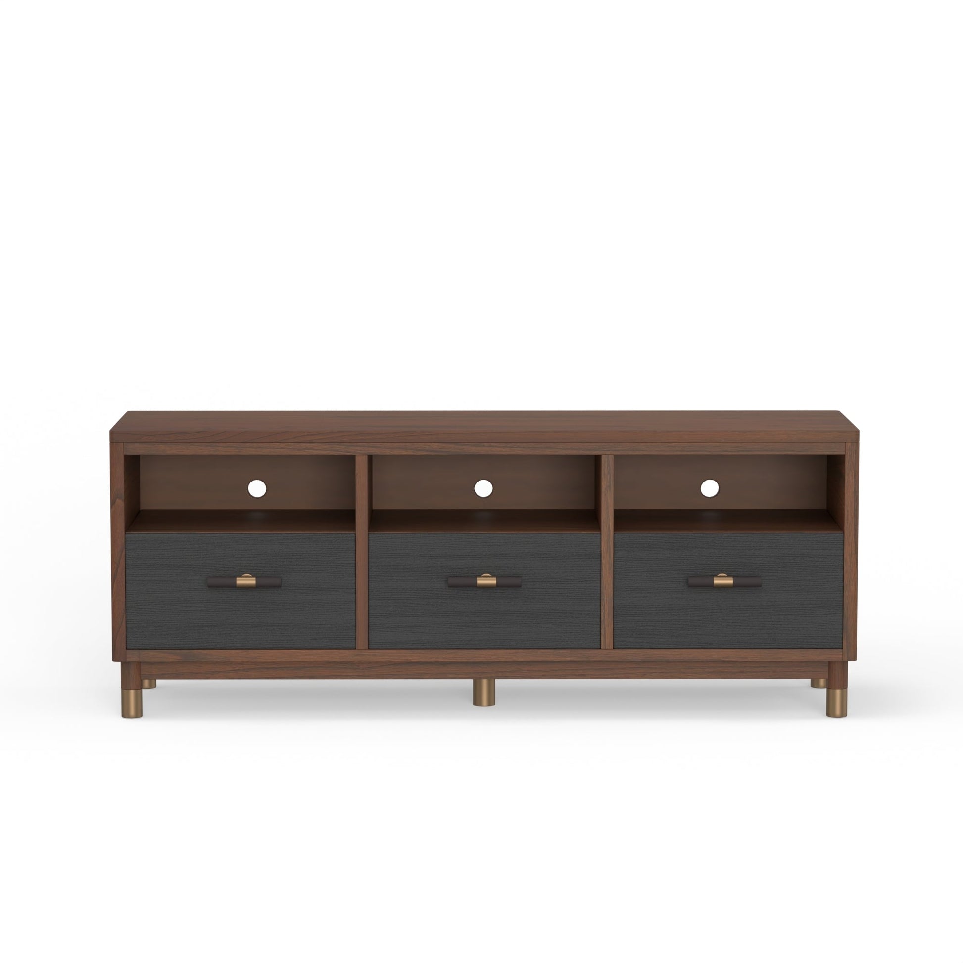 The Belham TV console with its beautiful two tone finish in Dark Walnut (Brown) and Black will surely compliment your home's aesthetic. The unit features 3 easy to access drawers constructed with English Dovetail drawer construction and metal ball bearing drawer glides. 3 open shelves provide for additional storage for electronics or for the essentials you love the most.