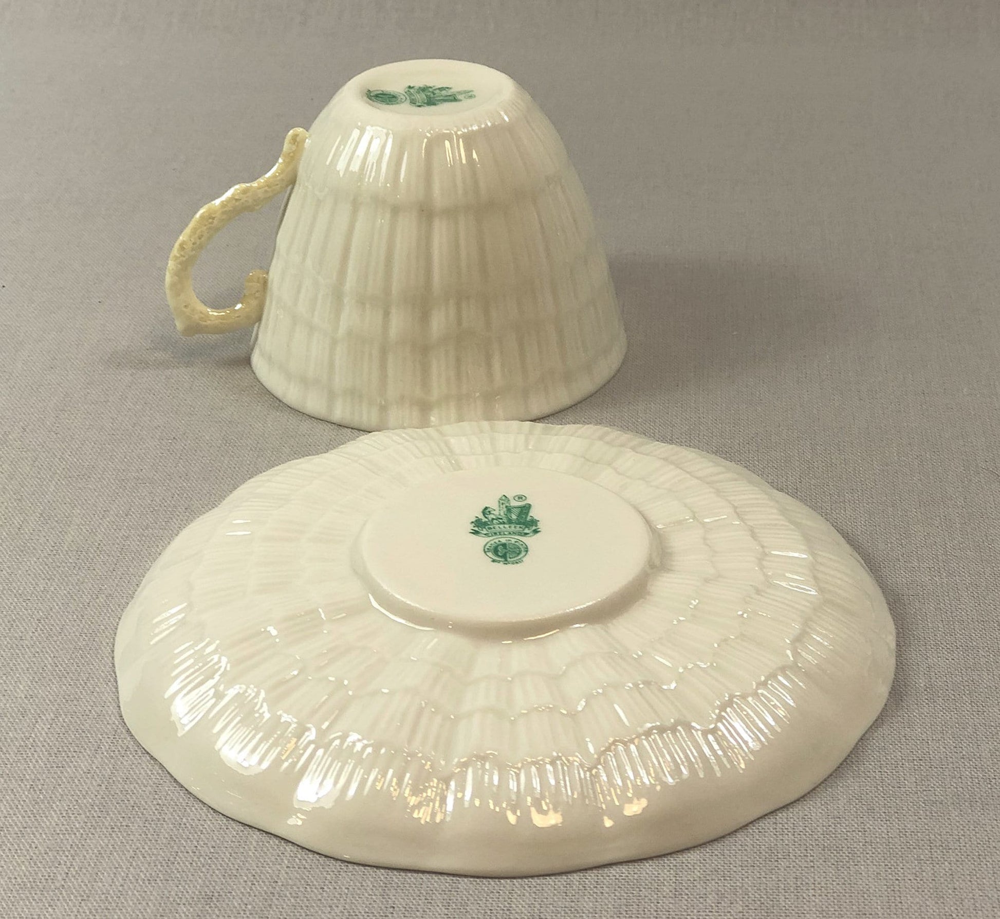 Belleek Cup and Saucer. Sea Shell Pattern Tea Set Made of Dainty Porcelain in Ireland. Antique Reg 0857.