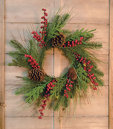 Made from shoots of festive pine greenery, the Berry Pinecone Ring also features stems of red berries and several large pinecones. Measures 6½" inside diameter and 20" outside diameter.