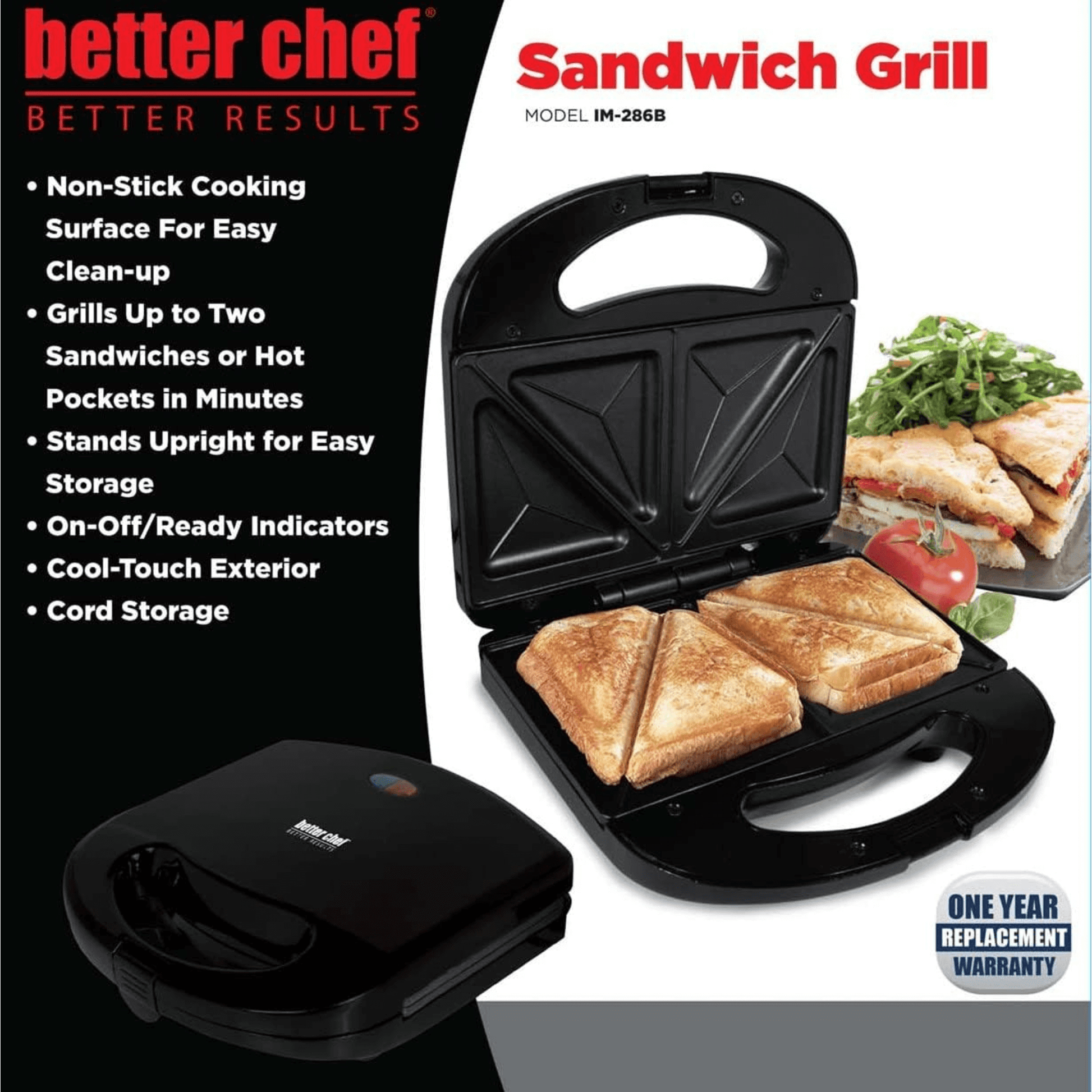 This Better Chef double sandwich maker features a non-stick cooking surface, facilitating easy cleanup after use. It can grill up to 2 sandwiches or hot pockets within minutes, offering a quick and convenient meal option. When not in use, it stands upright for easy storage, saving space in your kitchen. On/Off/Ready indicators provide clear signals during the cooking process. Additionally, it boasts a cool-touch exterior, ensuring safe handling even when in operation. The cord storage feature helps keep the cord neatly organized when the sandwich maker is not in use, further contributing to its convenience and tidy appearance on the countertop.