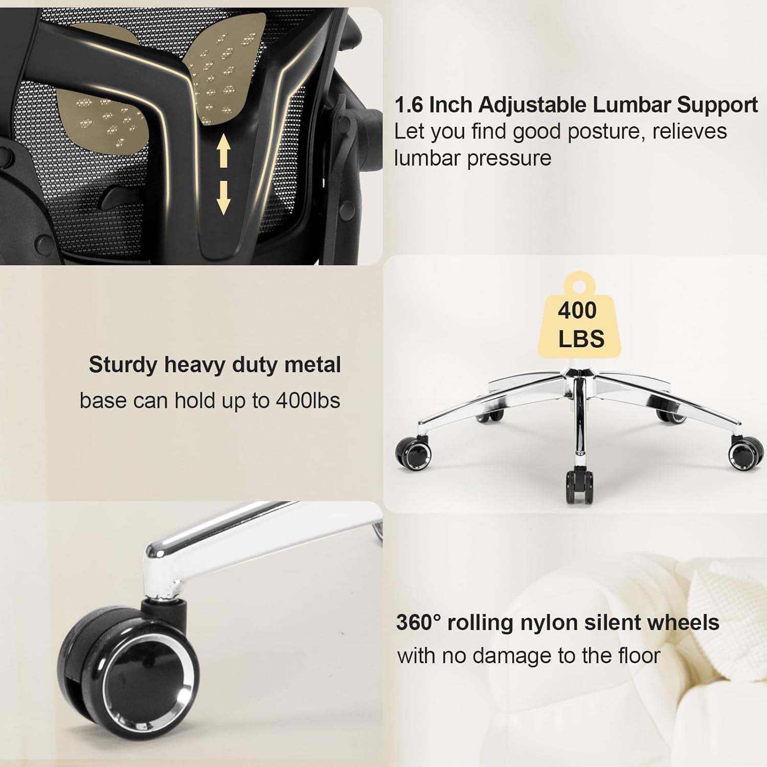 - Heavy-Duty Weight Capacity up to 400 lbs with a robust steel base and SGS level 4 gas lift cylinder for unmatched stability.