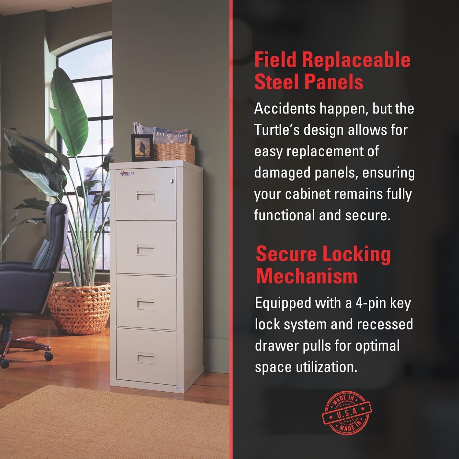 - Water-resistant design: ETL Verified listing protects contents from sprinkler systems and fire hoses.