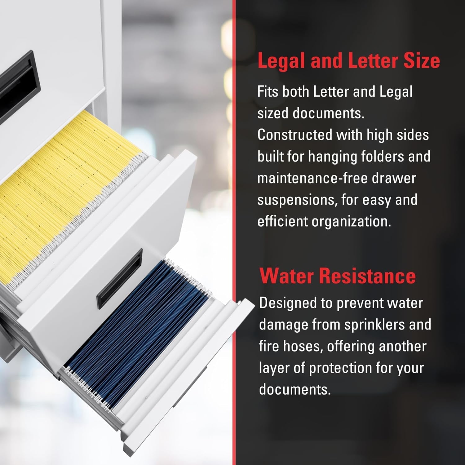 - Spacious dual drawers: Two easy-slide drawers fit both legal and letter-size hanging or standard file folders.