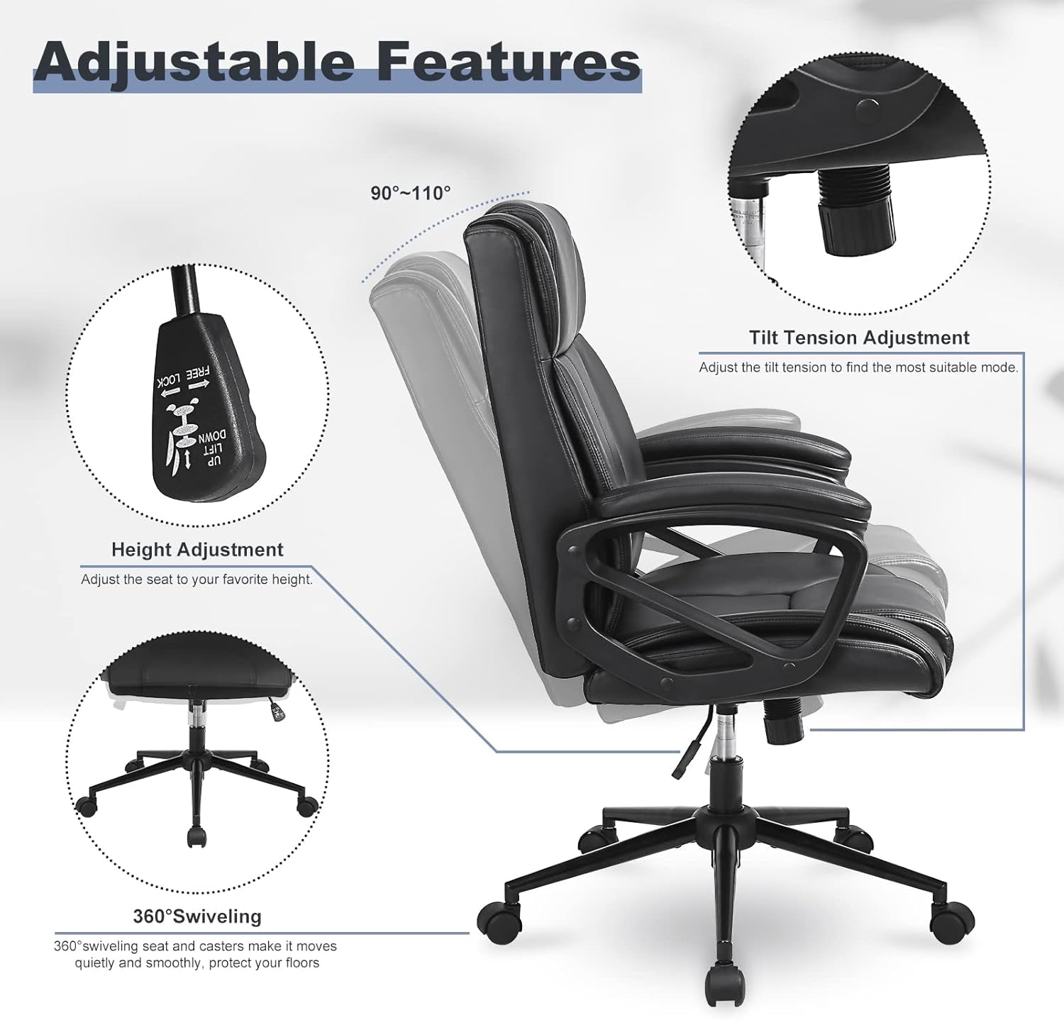 - Adjustable Height & Recline: SGS-certified gas lift with chair height from 40.55" to 43.7" and seat height from 15.35" to 18.50", plus backrest tilt from 90° to 110° for customized comfort.
