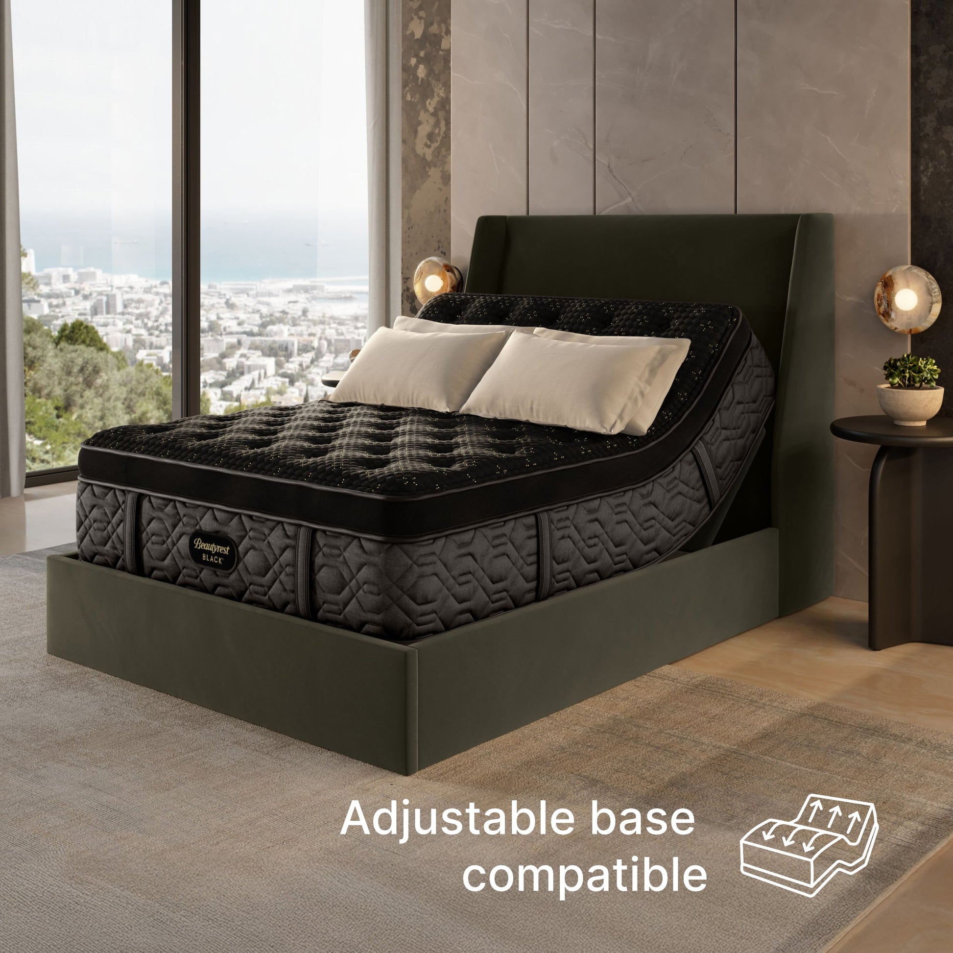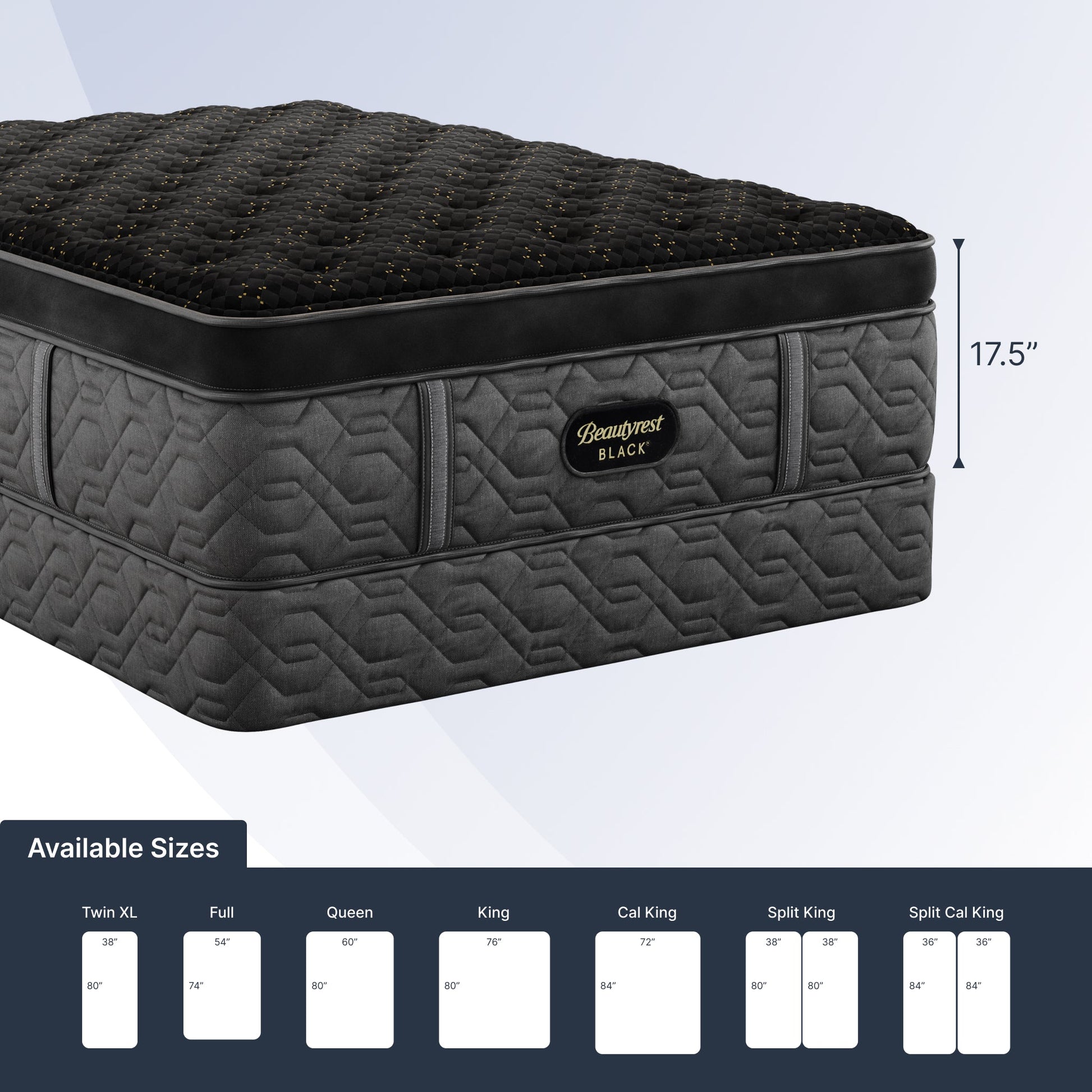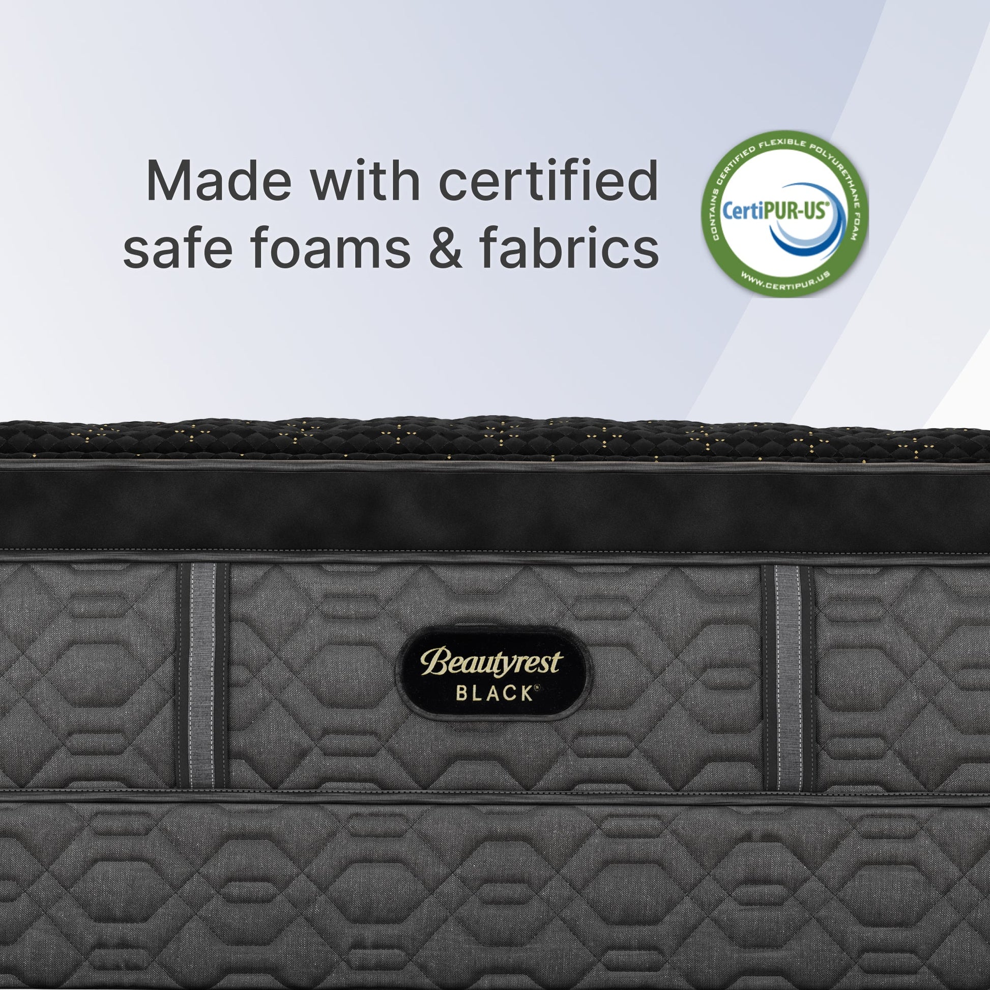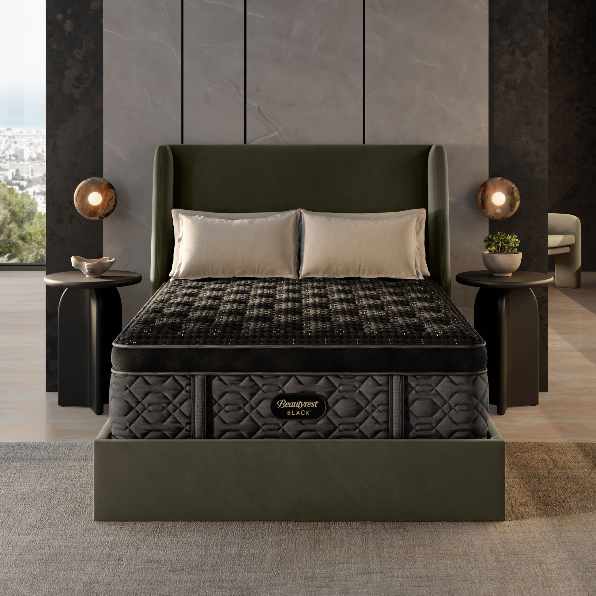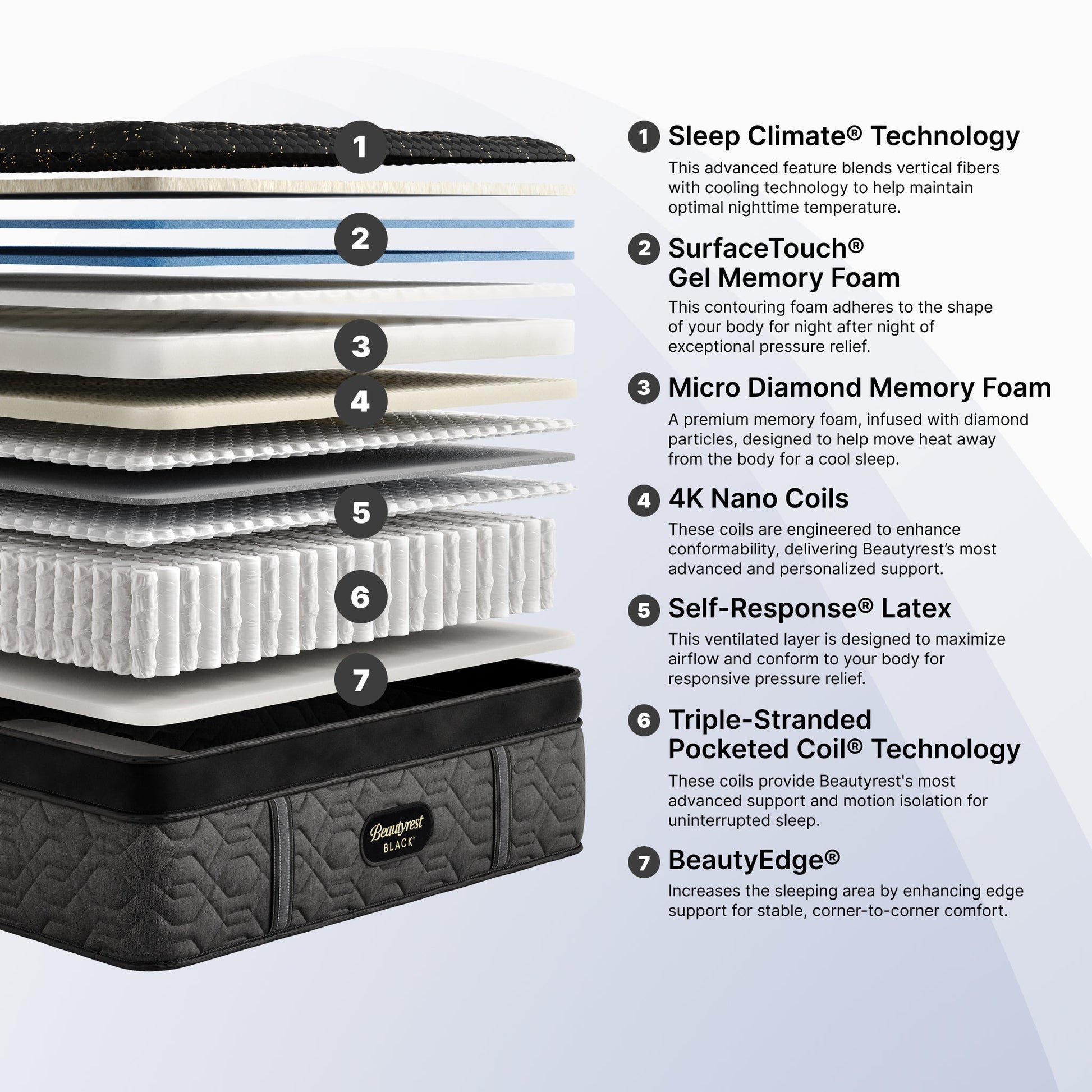 Discover where luxury meets innovation with Beautyrest Black®. Designed with Triple-Stranded Pocketed Coil® Technology, this mattress offers our most premium individualized support and motion separation with a 4K Nano Coil upgrade. Sleep Climate™ Technology works with a Micro Diamond™ Memory Foam upgrade to enhance heat transfer from the body while SurfaceTouch™ Gel Memory Foam and Self-Response™ Latex upgrades conform to the body for responsive pressure relief. Experience our most advanced sleep system with Beautyrest Black®, so you can rest luxuriously.