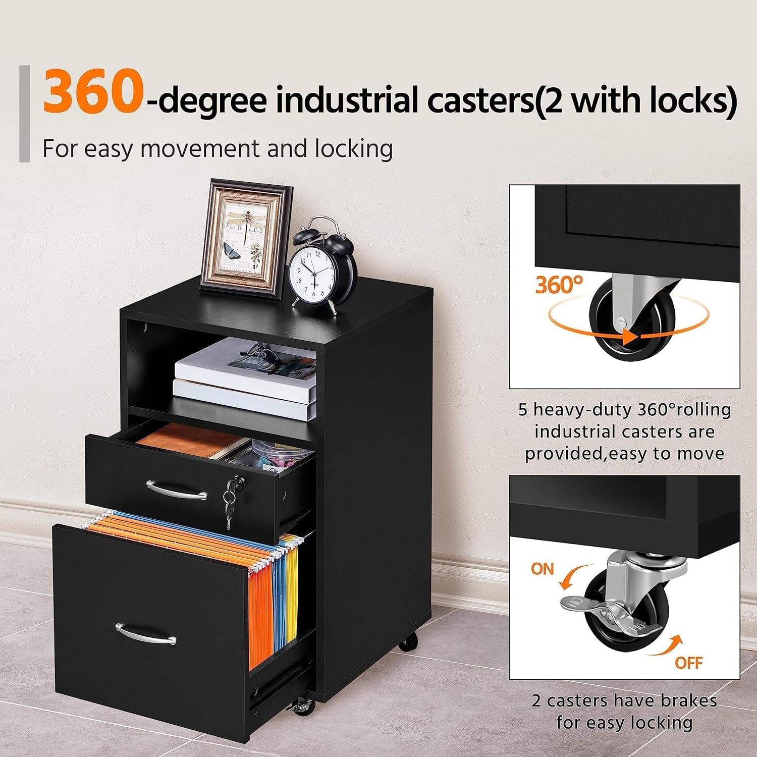 Black Under Desk File Cabinet 2 Drawers Lockable Wheels