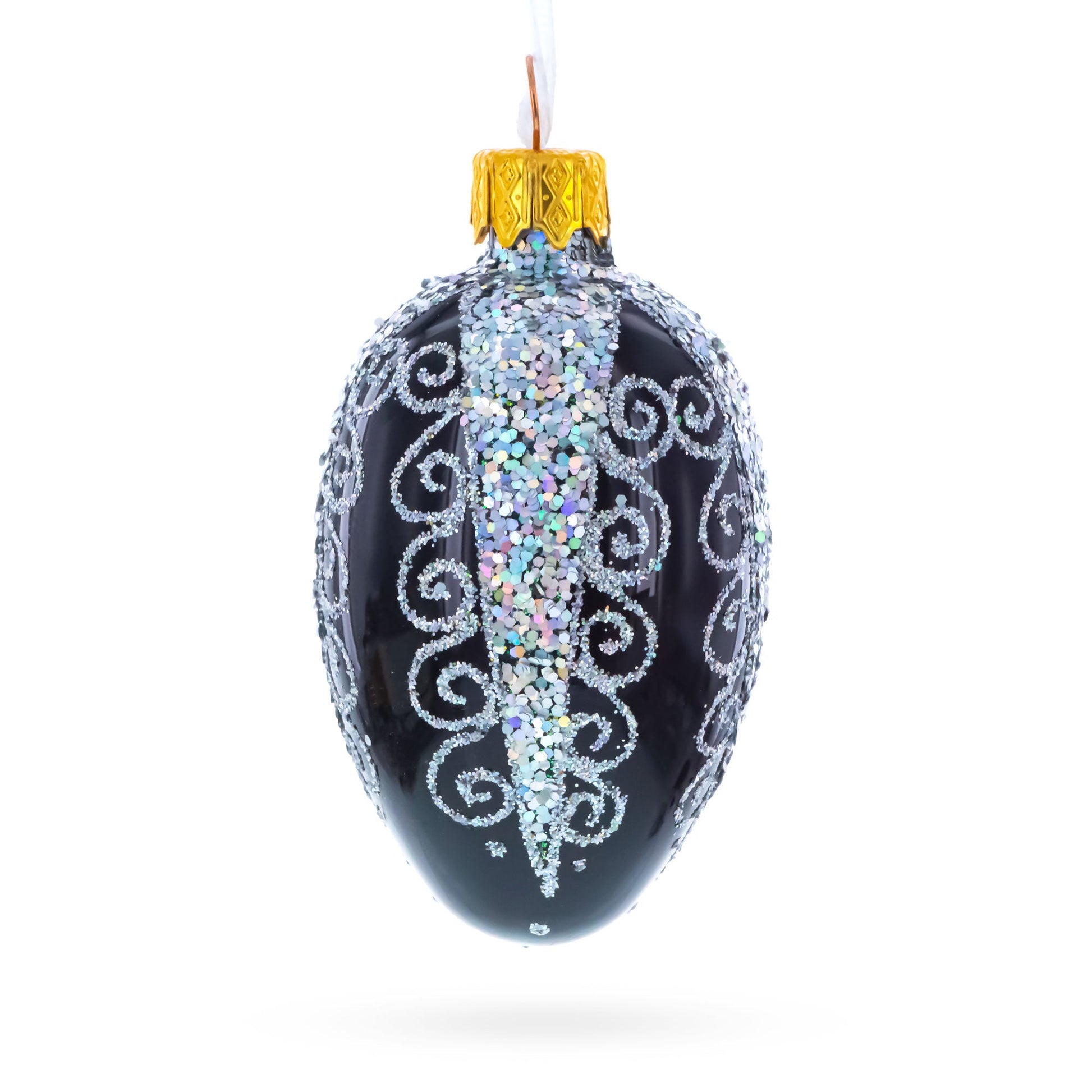 Black with Silver Glitter Swirls and Sequins Mini Glass Egg Ornament 2.9 Inches