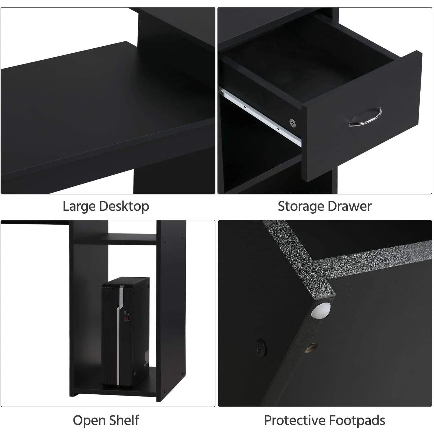 Spacious DesktopWaterproof melamine veneered desktop provides an adequate workplace and easy to clean | Durable Metal HandleHeavy-duty glossy drawer pull for your convenience | 2 Open ShelvesFor CPU and books/folders storage | Protective Foot PadsPrevent damaging the wood floor when moving and slipping |