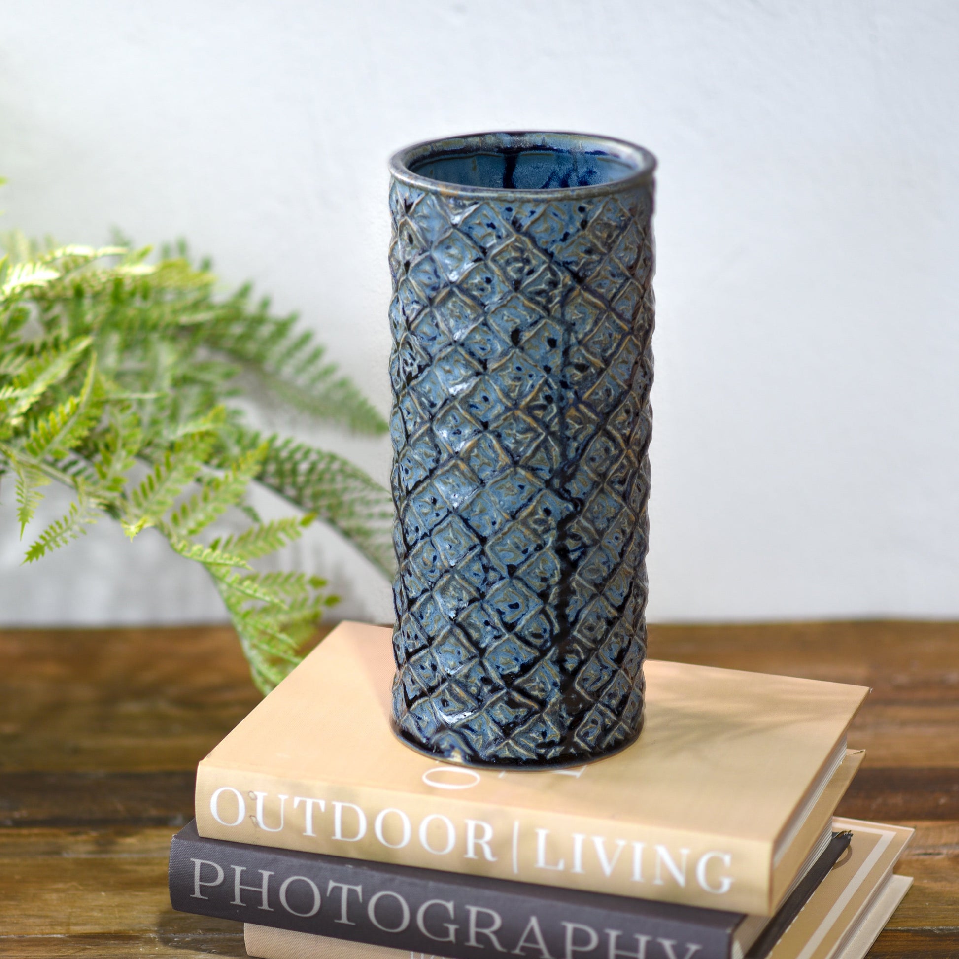 These tall ceramic vases feature a rich, dark blue glaze and an embossed diamond pattern that adds texture and depth to any display. Their cylindrical shape and glossy finish make them a bold accent for floral arrangements or as standalone pieces on a shelf or table. Each vase is sold individually and looks striking whether styled solo or as a pair.