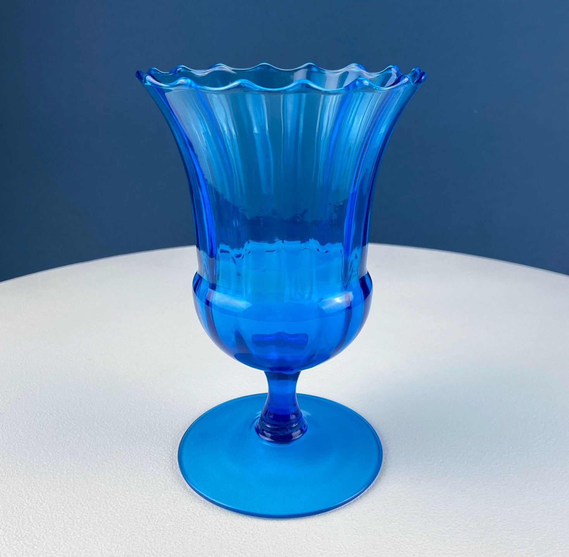 Blue Hand-Blown Glass Footed Vase. Fluted Large Goblet with Scalloped Brim. Collectible Modern Glass. Excellent Condition. Not Marked by the Manufacturer.