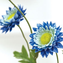 The Blue Strawflower Spray is a unique floral accent for springtime or everyday decorative displays. A long plastic stem splits into a cluster of branches which each sprout rich green leaves with a spiky, realistic design. Blooms top the branches with soft, realistic petals in dimensional blue and pale blue color. Measures 25” long by 4” wide by 1.5” deep.