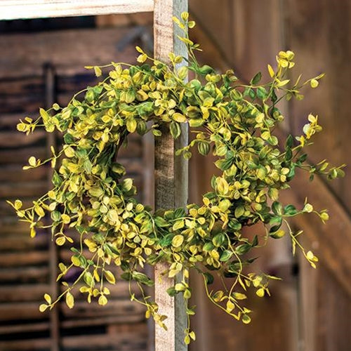 Bog Pimpernel Candle Ring is perfect for fall with leaves in shades of green, old gold and olive and can be displayed on a table or wall. The faux ring has small elongated leaves from …" to 1" in length on a natural twig wreath base. The ring has a 4½" inside diameter and a 14" outside diameter.