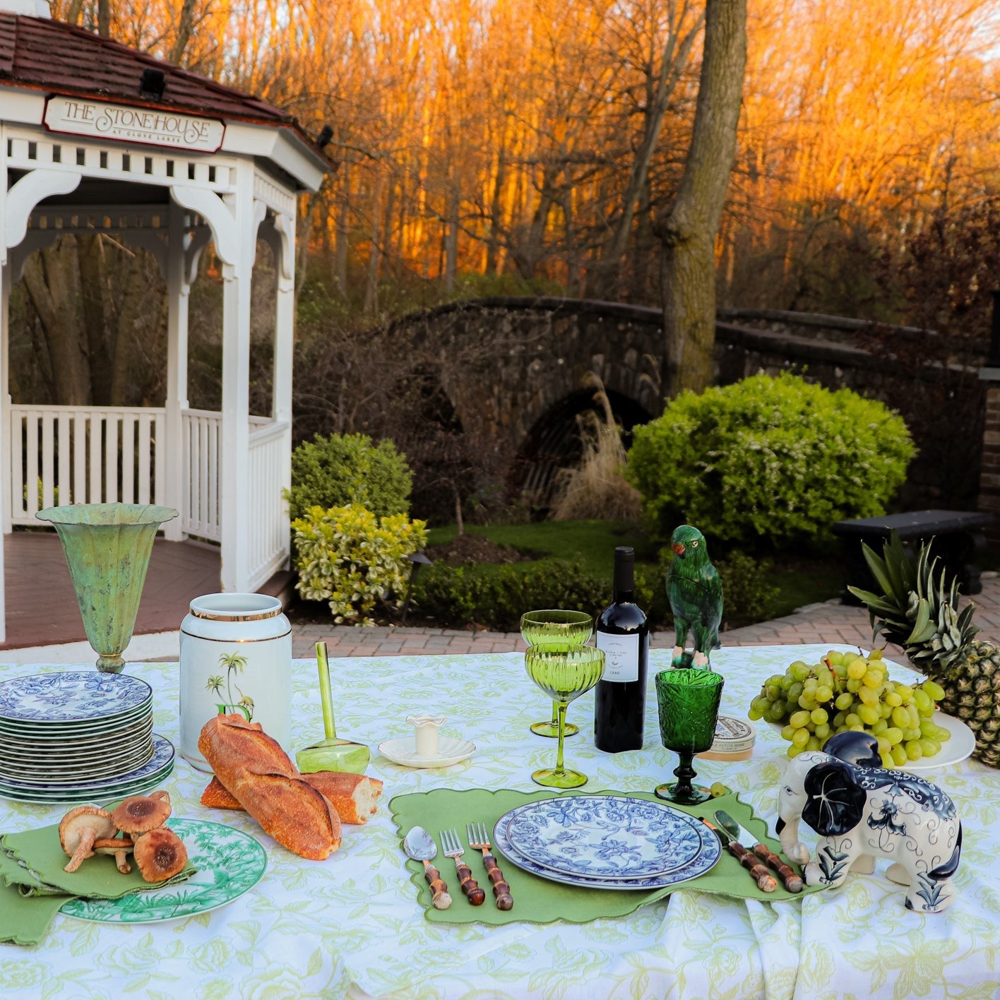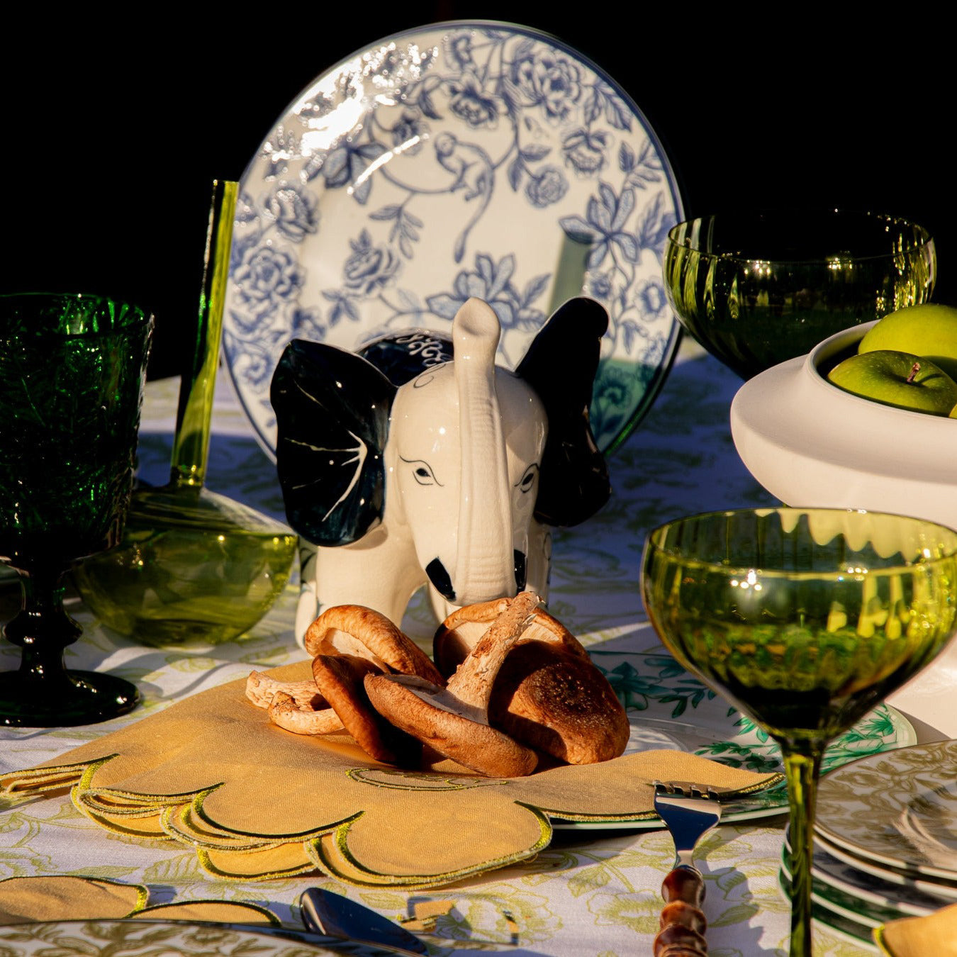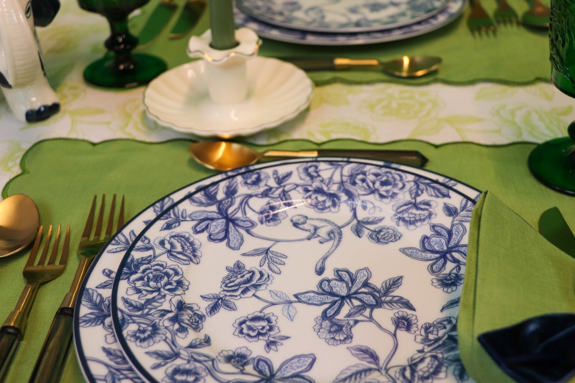 Part of our Shimla Social Collection, the Bombay Blue Starter Plate captures the whimsy of a dense jungle, intricately painted in a safari green with branching tendrils, lush leaves, and vibrant blooms, evoking the rich tapestry of history and aesthetics from that era. If you look closely enough, you may even be able to spot a monkey hanging off a bough. Can be matched with Shimla Social coordinating pieces to create a complete place setting.