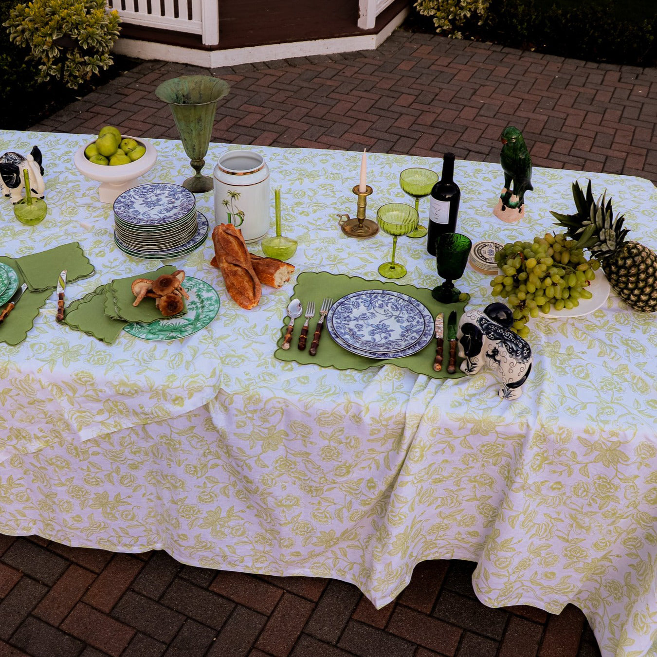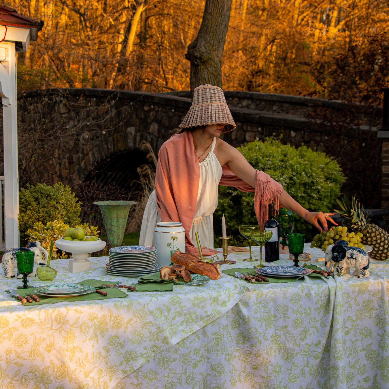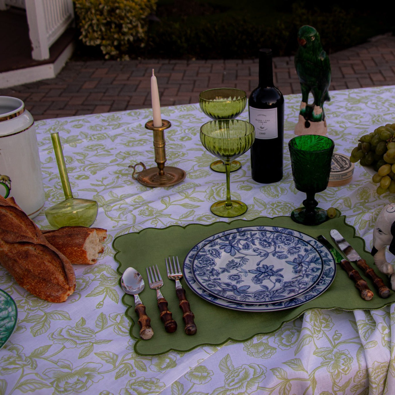 Part of our Shimla Social Collection, the Bombay Blue Starter Plate captures the whimsy of a dense jungle, intricately painted in a safari green with branching tendrils, lush leaves, and vibrant blooms, evoking the rich tapestry of history and aesthetics from that era. If you look closely enough, you may even be able to spot a monkey hanging off a bough. Can be matched with Shimla Social coordinating pieces to create a complete place setting.