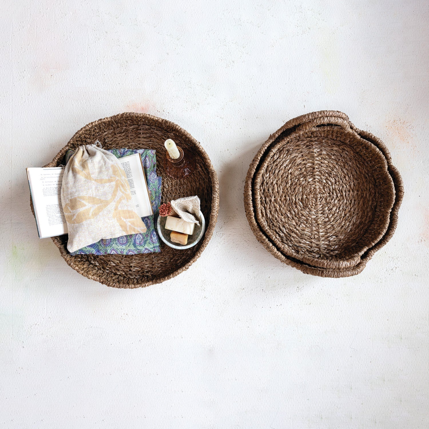 Handwoven from natural bankuan and rattan, these decorative trays feature a scalloped edge design and sturdy handles for easy use. Available in three sizes, each tray is sold individually so you can select the perfect size or mix and match to create a set. Perfect for serving, organizing, or displaying decor, these trays add a warm and organic texture to any space.
