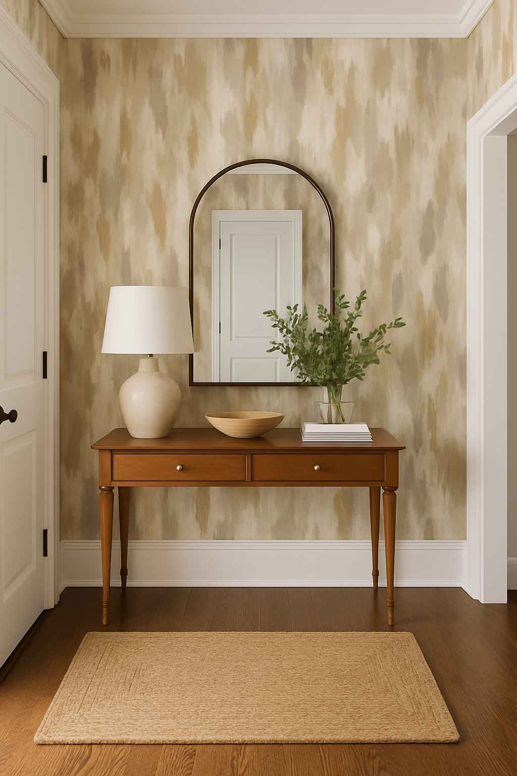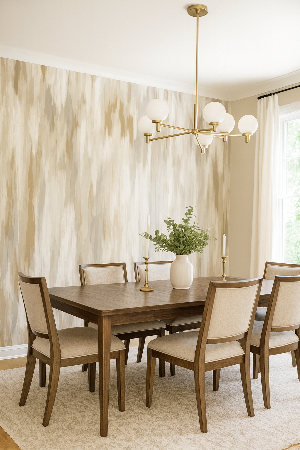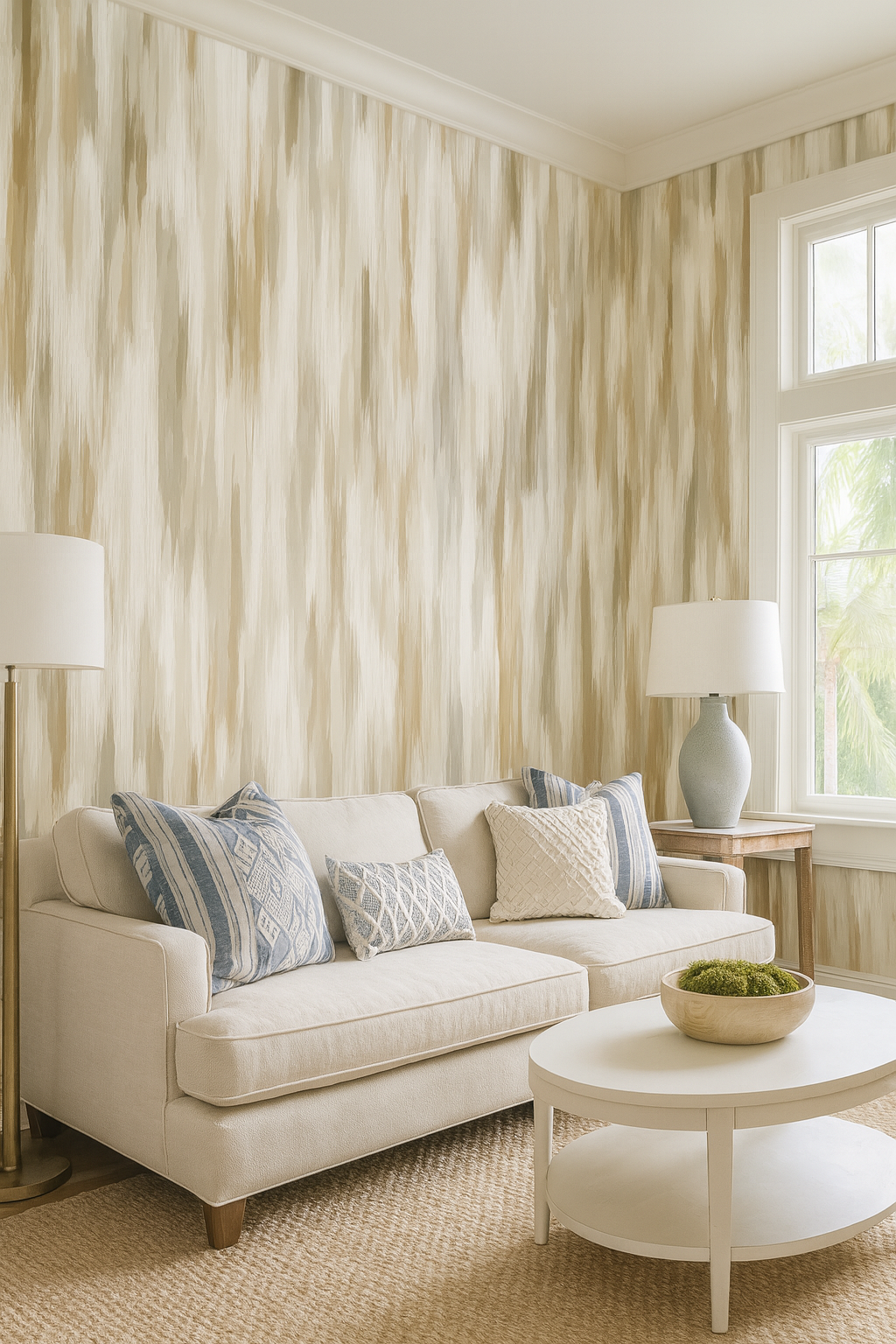 Brushed Dune offers a serene wash of earth tones through feathery vertical strokes in sand, taupe, cream, and stone. The subtle ombré effect mimics weathered textiles or bleached wood grain, perfect for minimalist interiors, Japandi-style homes, and spa-like bathrooms. It’s a calming, texture-forward choice without visual clutter.