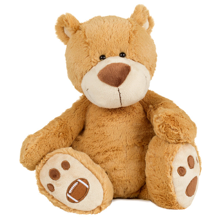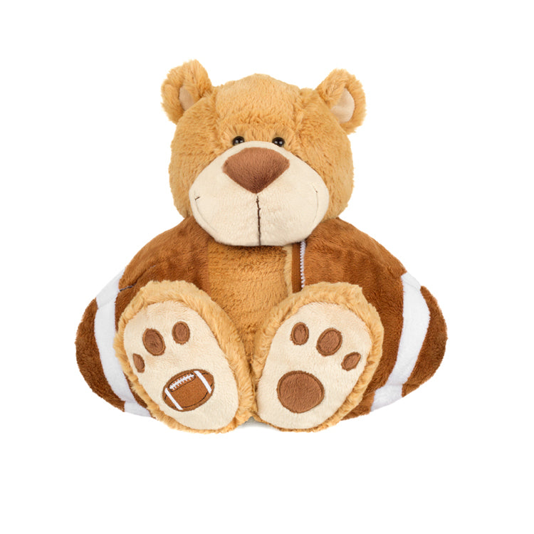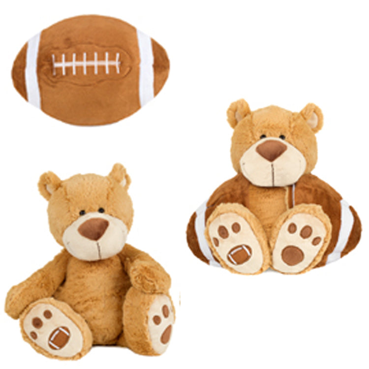 - Beautiful, soft, cuddly 16" tan teddy bear converts into an 12" x 8" x 8" football