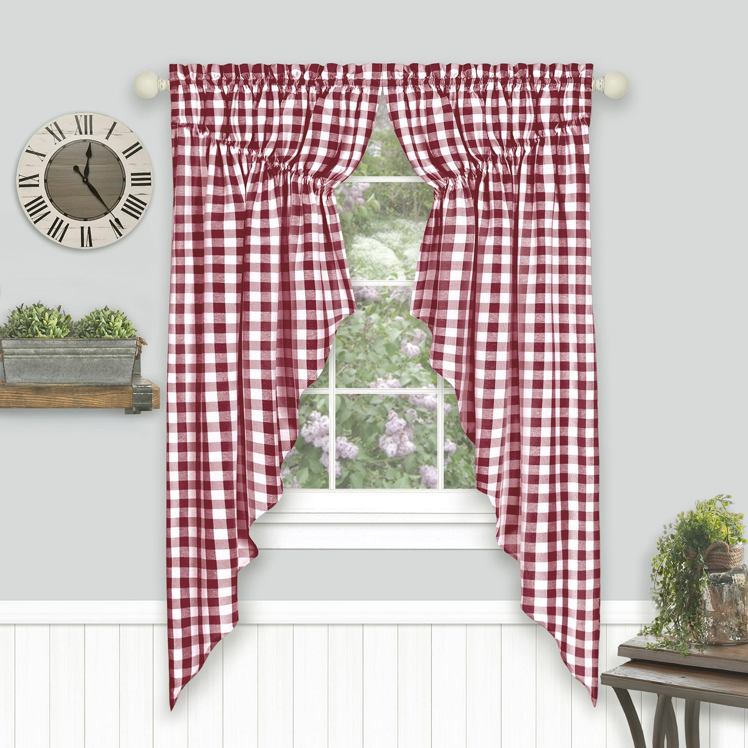 Redefine the look of your window and add a gorgeous look to your space with the Buffalo Check Gathered Swag Window Curtain Pair. Bring a country charm and traditional look to your windows with this all over buffalo check pattern. The vibrant and attractive color will draw the attention of all your house guests and give your home some style. They look great alone or cross-coordinated with the Buffalo Check line of valances and curtains. Made of 100% premium, high-grade polyester, this swag pair is not only resistant to wrinkles, shrinking, mold and mildew, but it is also machine washable. This swag pair is thick enough to allow just the right amount of light to enter your home without sacrificing your precious privacy. CONTENTS: 2 Swags per package. DIMENSIONS: 72x63 Inches.