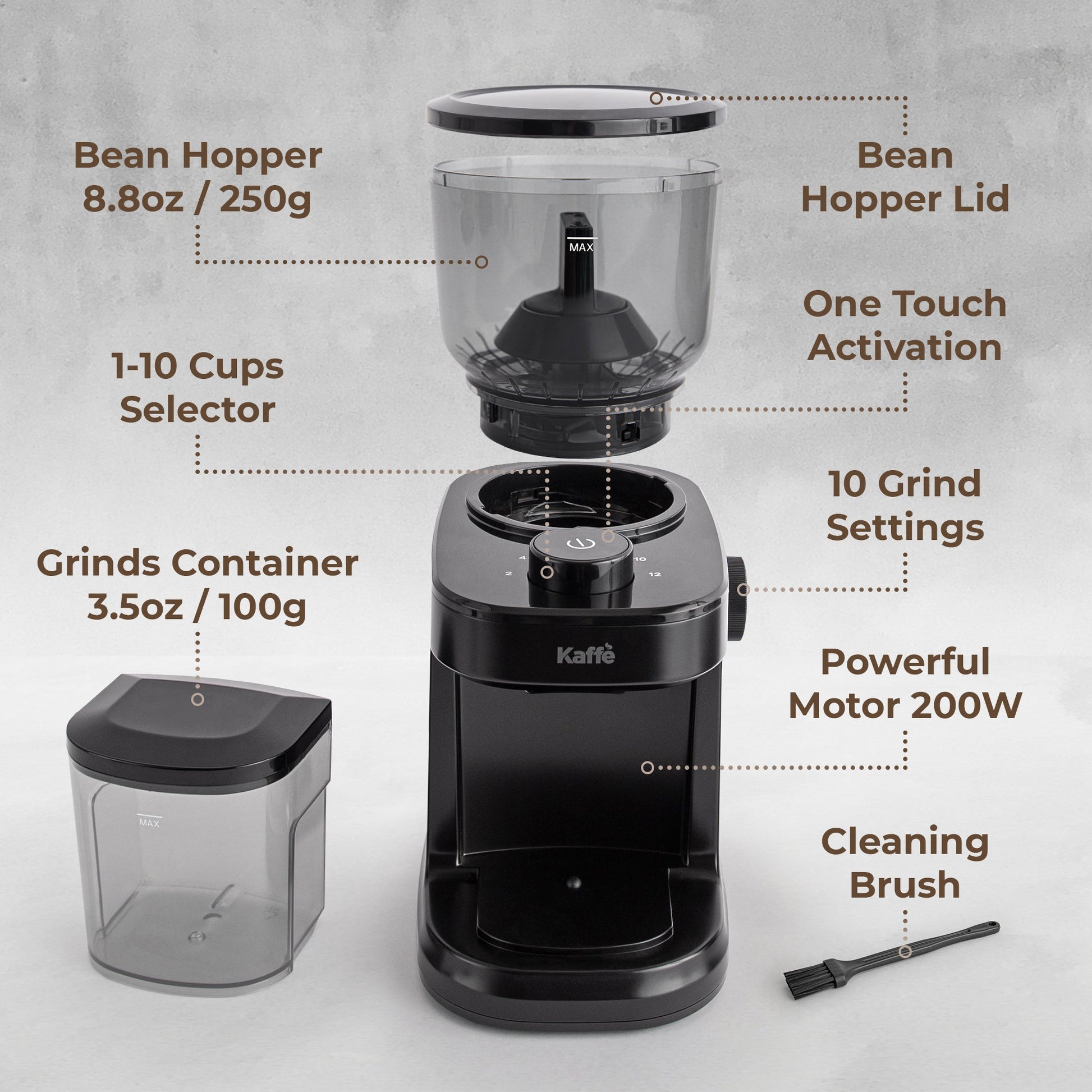 - POWERFUL AND PRECISE GRINDING. Equipped with a 200W motor and strong, durable flat burrs, this grinder delivers consistent results for a variety of brewing methods.
