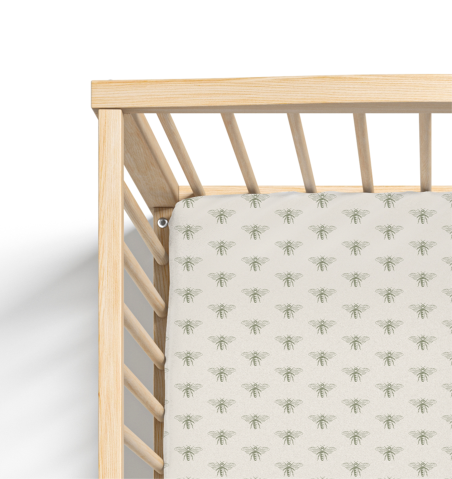 The pattern on the crib sheet showcases rows of cute honey bee line art, adding a touch of whimsy and sweetness to your baby's crib. Against a eggshell background, the honey bees are a charming moss green, creating a harmonious and captivating visual.