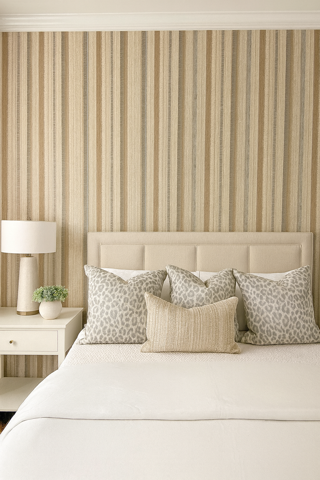 Inspired by traditional birchbark textures and folk weaving, this vertical stripe wallpaper blends beige, ivory, bark brown, and flax gray into a neutral, textural rhythm. Fine linework adds depth while the organic palette makes it incredibly versatile. Use it in Scandinavian hallways, rustic kitchens, or behind open shelving to add earthy character without overwhelming the space.