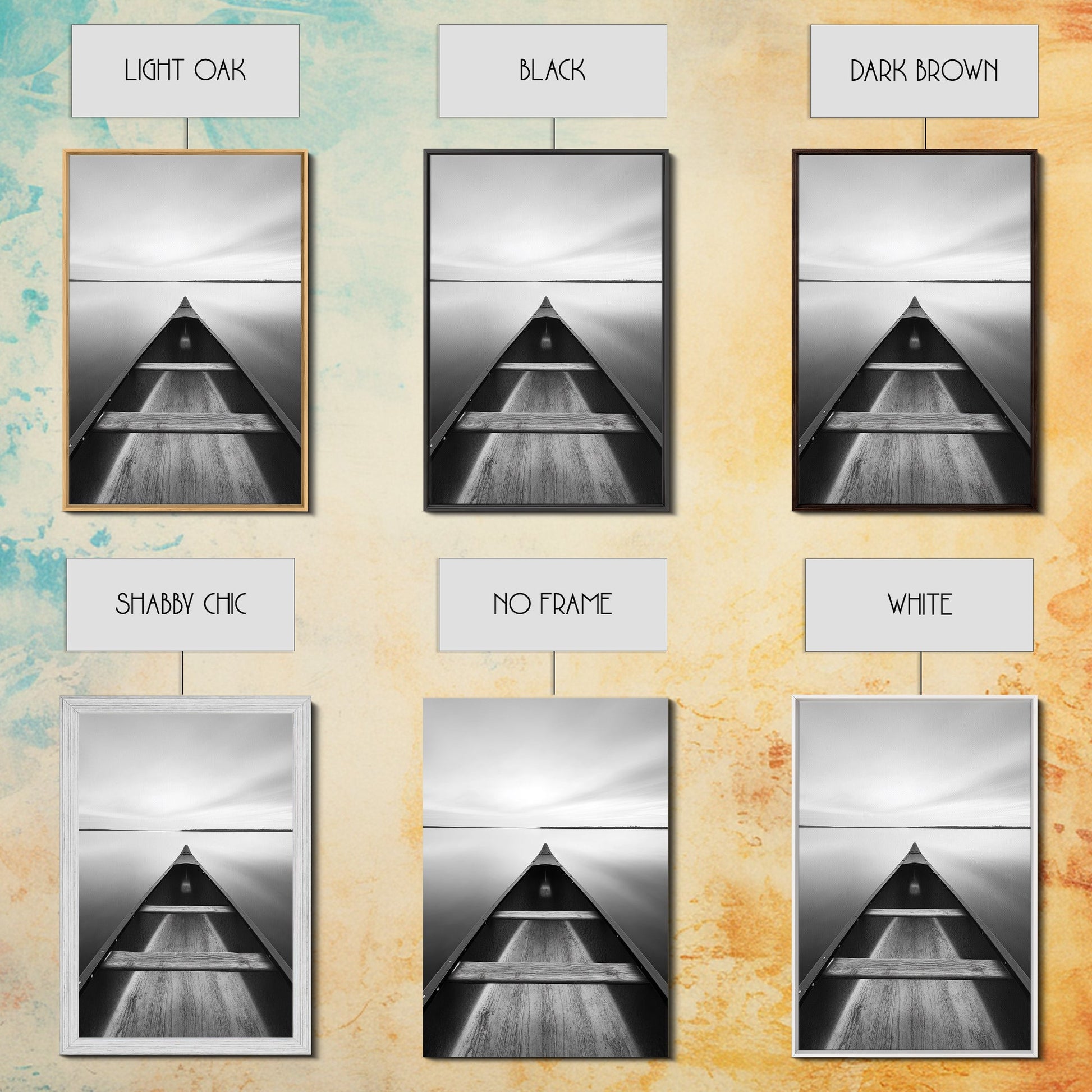 Canoe, Lake, Calm, Horizon - Minimalist lake paddle scene, Framed Canvas Print, peaceful home office art, Scandinavian decor, wilderness print