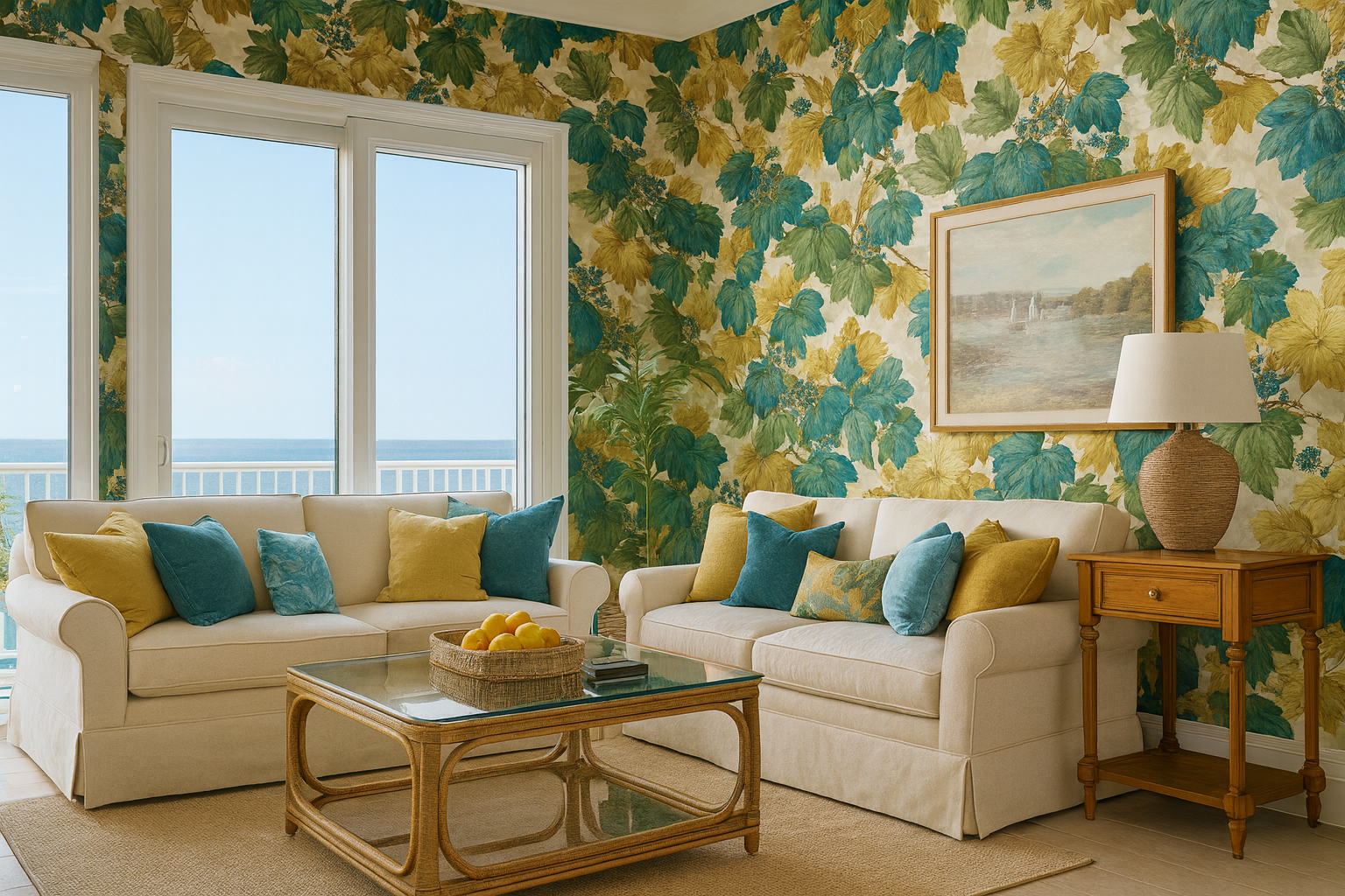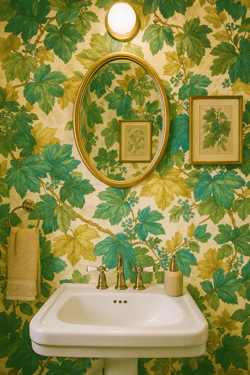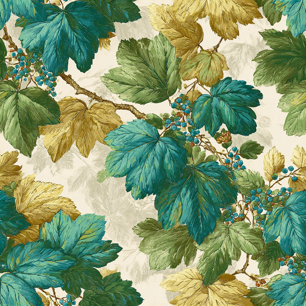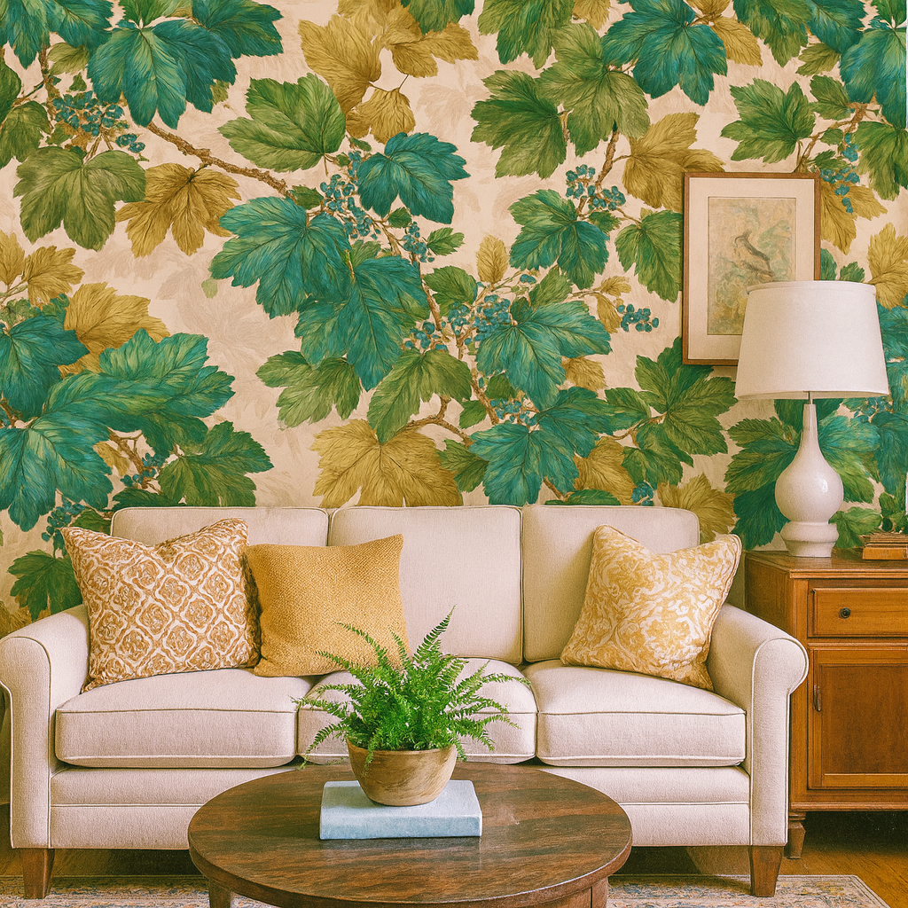 A lush overhead view of maple and elm leaves rendered in soft greens and browns. This wallpaper brings the tranquility of a forest canopy into your space. Great for sunrooms, reading nooks, or anyone searching for tree canopy wallpaper with a hand-painted feel.