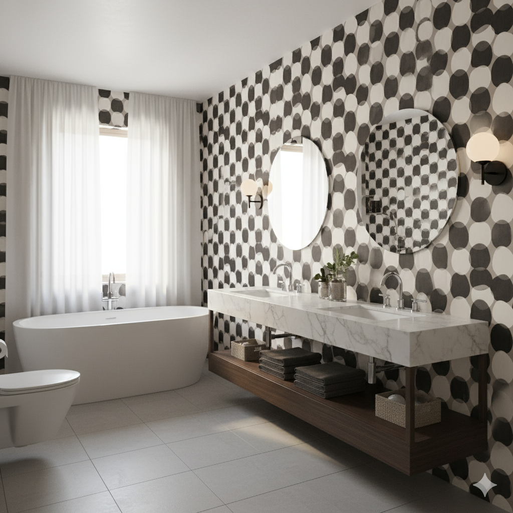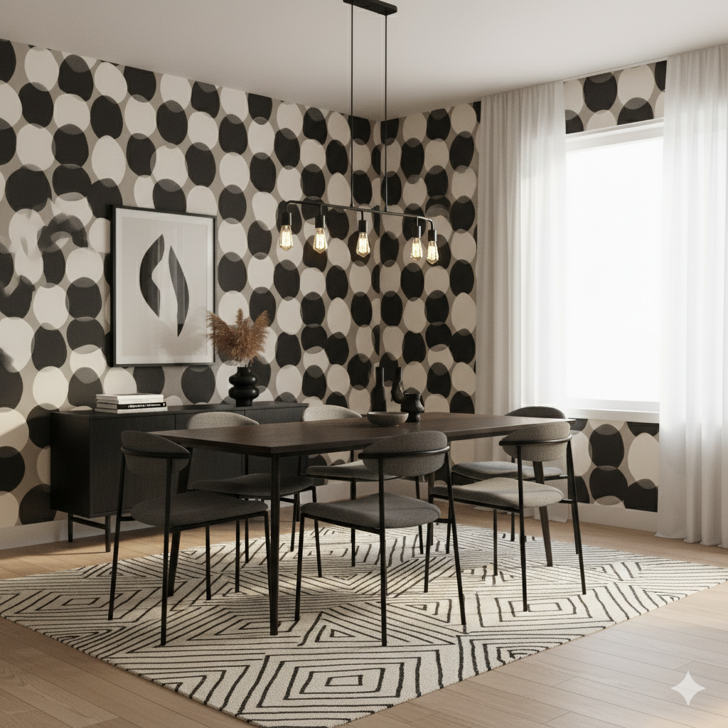 Oversized black and cream circles overlap across a taupe ground, creating a bold yet earthy polka-dot effect reminiscent of cowhide patterns reimagined through a modernist lens. The simplicity of the geometry makes it versatile for eclectic interiors, while the color palette anchors it firmly in Western ranch aesthetics. Ideal for playful powder rooms, kids’ spaces, or even an art-forward living room. It balances rustic inspiration with contemporary edge.