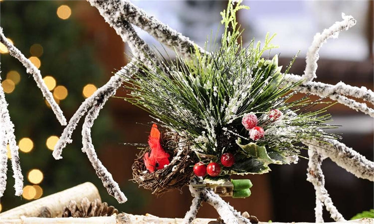 Decorative Clip consisting of a Pine Branch with Berries with a Cardinal nest attached.