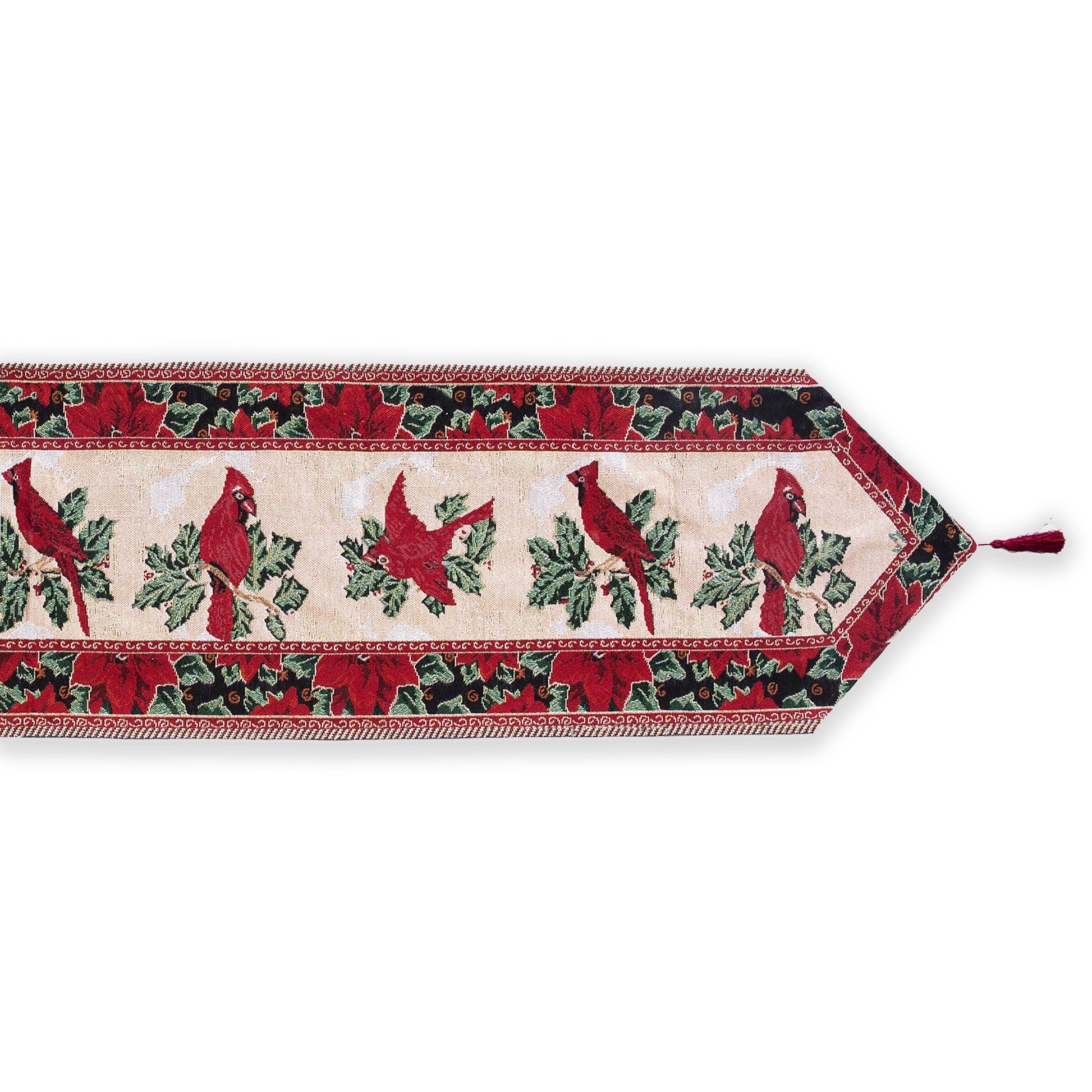 This table runner has a festive design, featuring a pattern of the famous Poinsettia flowers on the outer border, and cardinals and mistletoe along the center. This premium table decoration will compliment any table arrangement during the holidays!