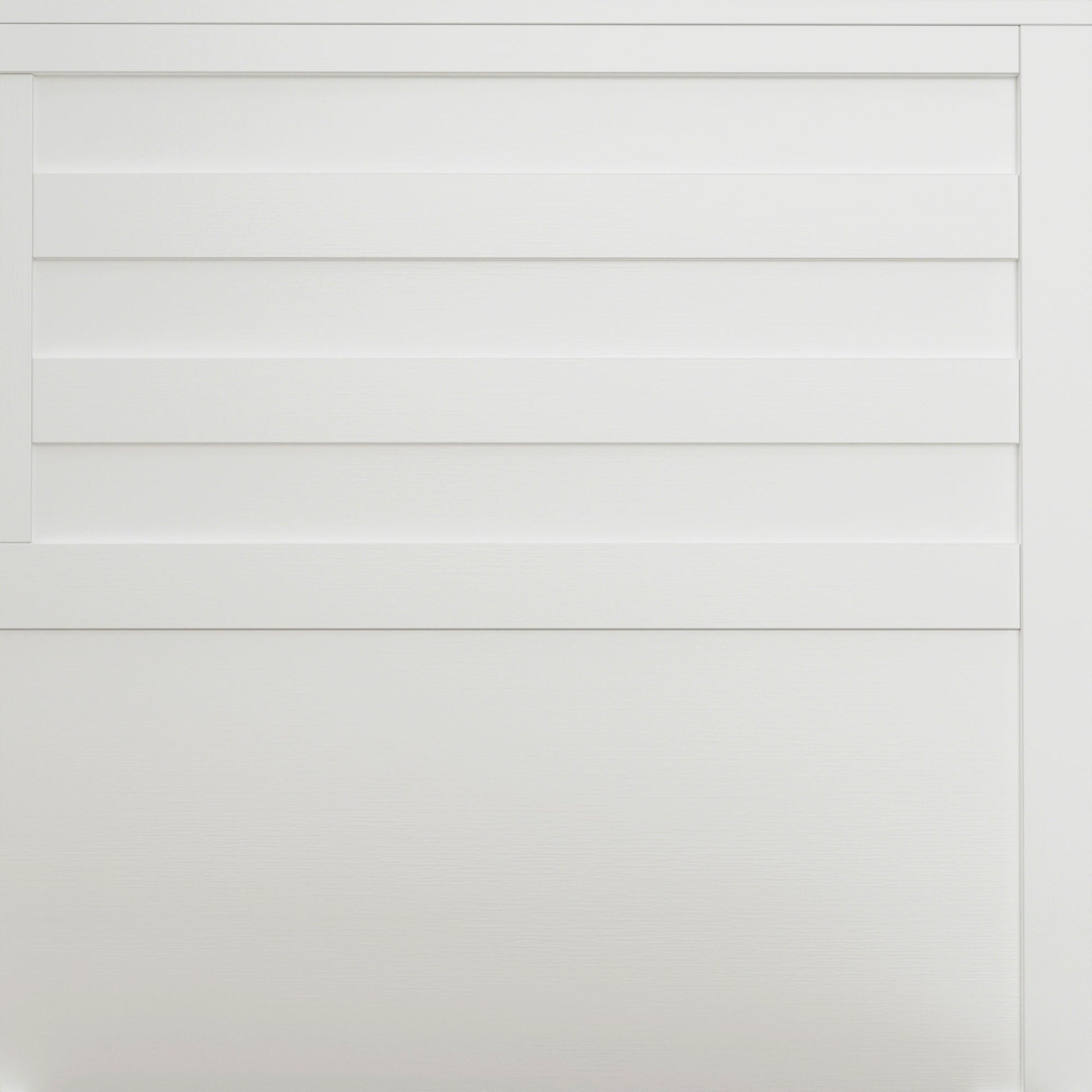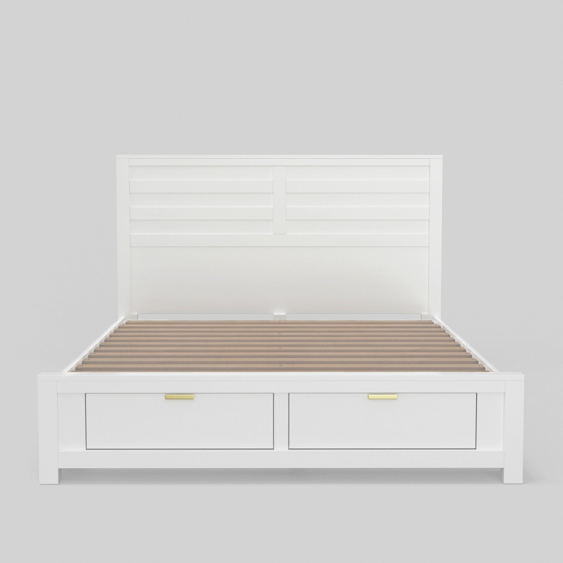 The Carmel Storage Platform Bed combines functionality and contemporary style. The beautiful panel headboard is striking in a white or cappuccino finish. Two storage drawers provide a place to put pillows, blankets, and linens. Simple nickel drawer handles accent the piece. The bed comes with a complete set of slats, no box spring required. Available in multiple sizes. Coordinates with other pieces from the Alpine Furniture Carmel bedroom collection sold separately.