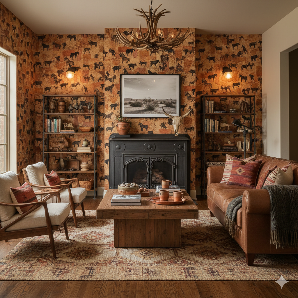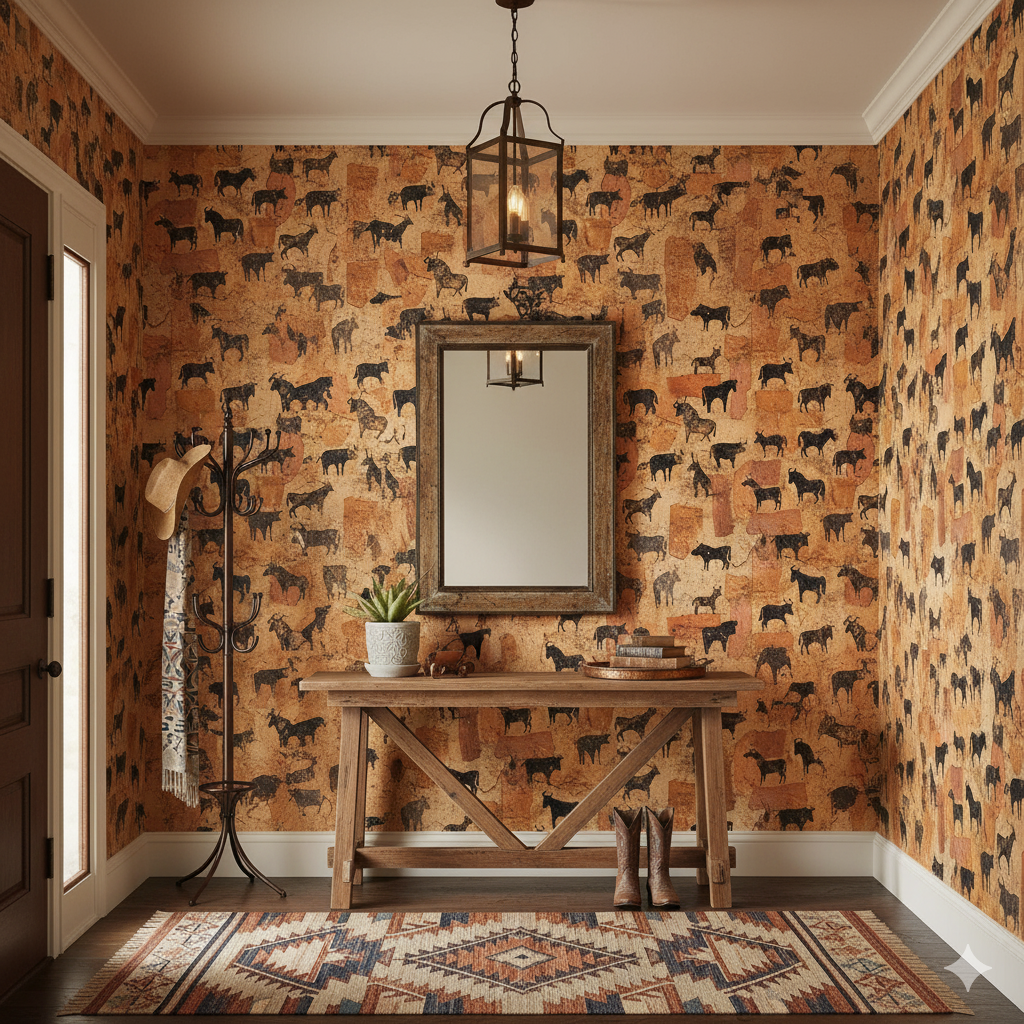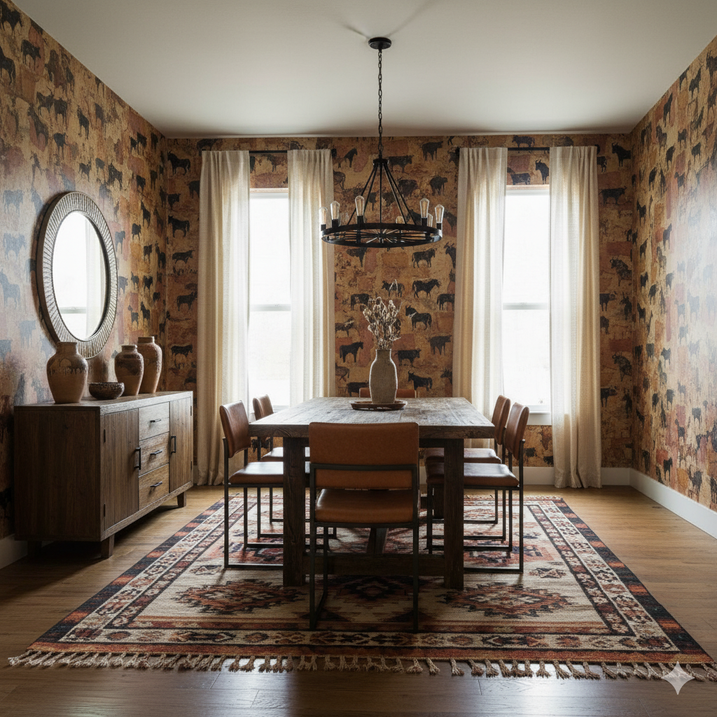 A wall alive with primal energy, this pattern recalls the animal figures of ancient cave murals. Black silhouettes of cattle are painted across a backdrop of layered clay tones — terracotta, ochre, sienna, and dusty sandstone. Each figure is slightly varied, as though hand-rendered, imbuing the wallpaper with authenticity and texture. The overall effect is both archeological and deeply aesthetic, capturing the drama of early human storytelling through art. Perfect for rustic lodges, ranch homes, or eclectic dining spaces, this design marries earthy history with modern interior styling. It pairs especially well with leather furniture, woven rugs, and stone fireplaces.