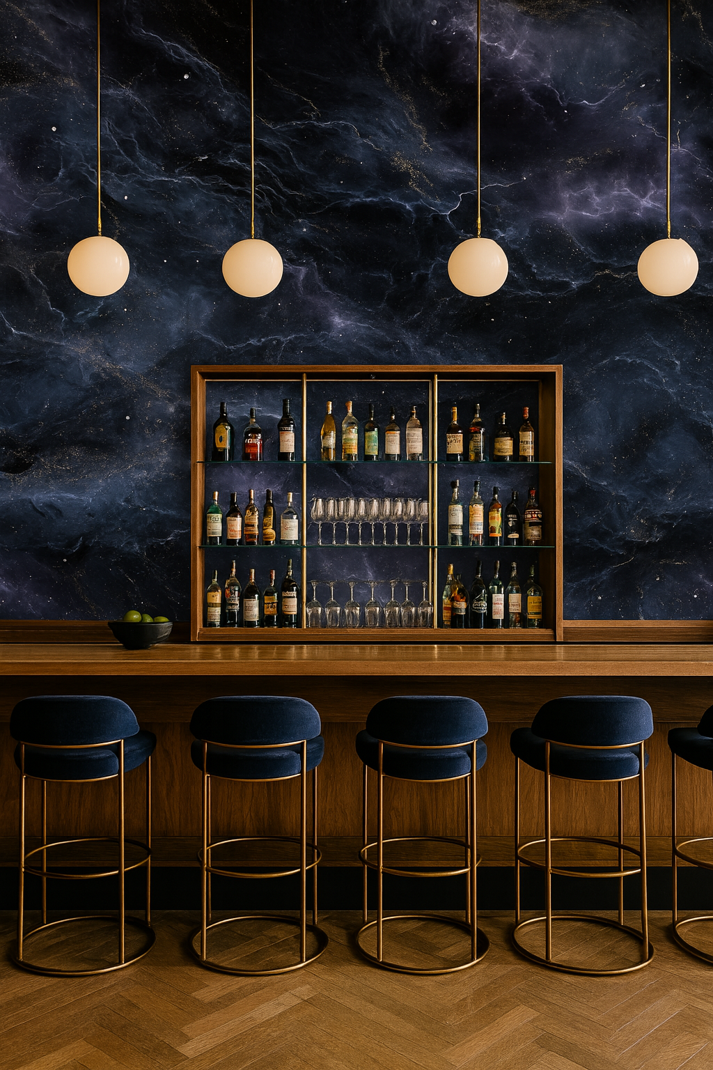 Celestial Veins captures the cosmos in motion. With swirling violet, midnight blue, and obsidian tones streaked with galactic gold, this wallpaper evokes distant nebulae and stardust trails. Perfect for statement ceilings, stargazer bedrooms, meditation rooms, or futuristic creative studios.